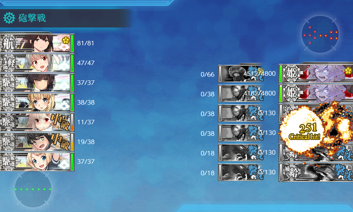 1隻は主砲2見張り員。複縦陣でしたが何故かあと1隻が当たらない。やけくそで最後ナナメで行い