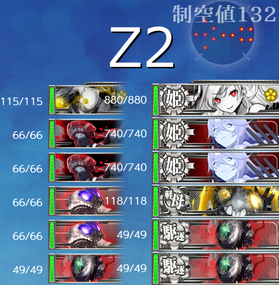 ボス(Z2),[第四陣形]強編成だと"深海地中海棲姫"が2隻ですしなかなか強力な編成ですがこちらの火力も何故かよく通るので案外どうにかなります。とは言っても基地なしでA勝利が安定するかと言われると微妙なところなので基地の代わりに決戦支援を送って多少の補助をすることで7~8割ぐらいはA勝利取れるんじゃないでしょうか。
