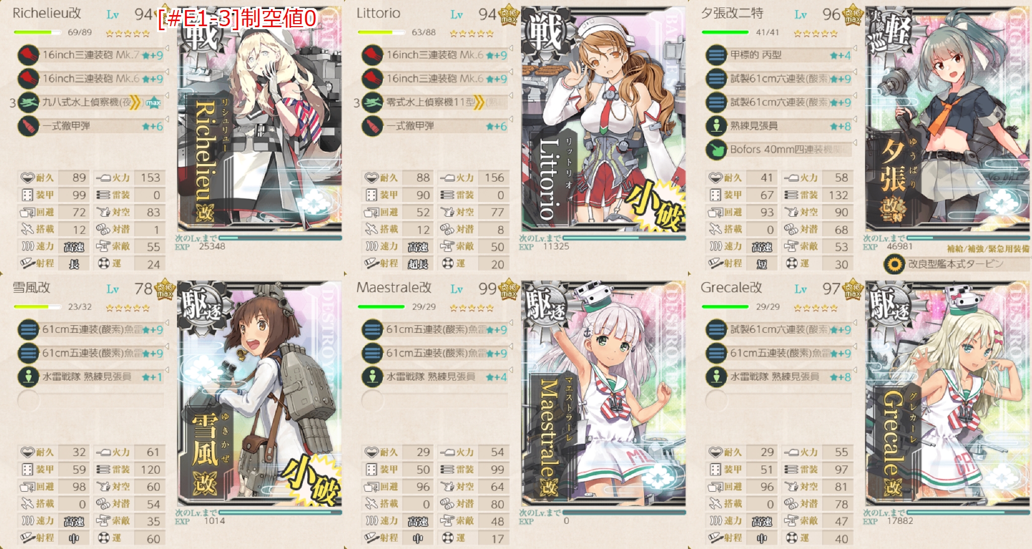 √固定編成は【[欧州艦3↑or軽巡2↑]+戦艦2↓+空母系0+駆逐3↑+高速統一】。