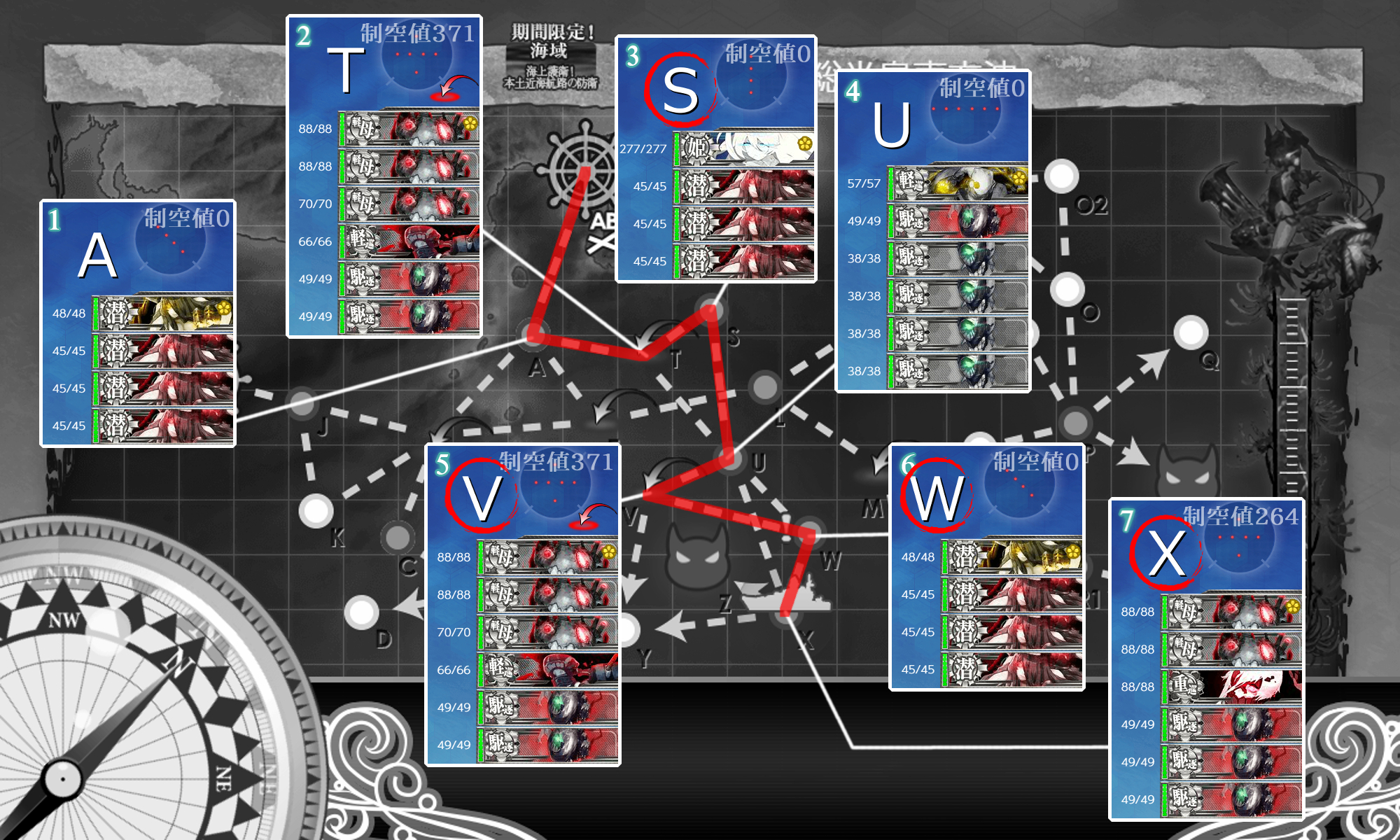あとは【単艦退避】出来るようにしてますが3戦目(U)までに【単艦退避】すると最短√ではなく"Vマス(空襲戦)"→"Wマス(潜水艦)"を経由することになるので注意。その√でもボス撃破は狙えるので到達出来るなら正直何でもありですが。