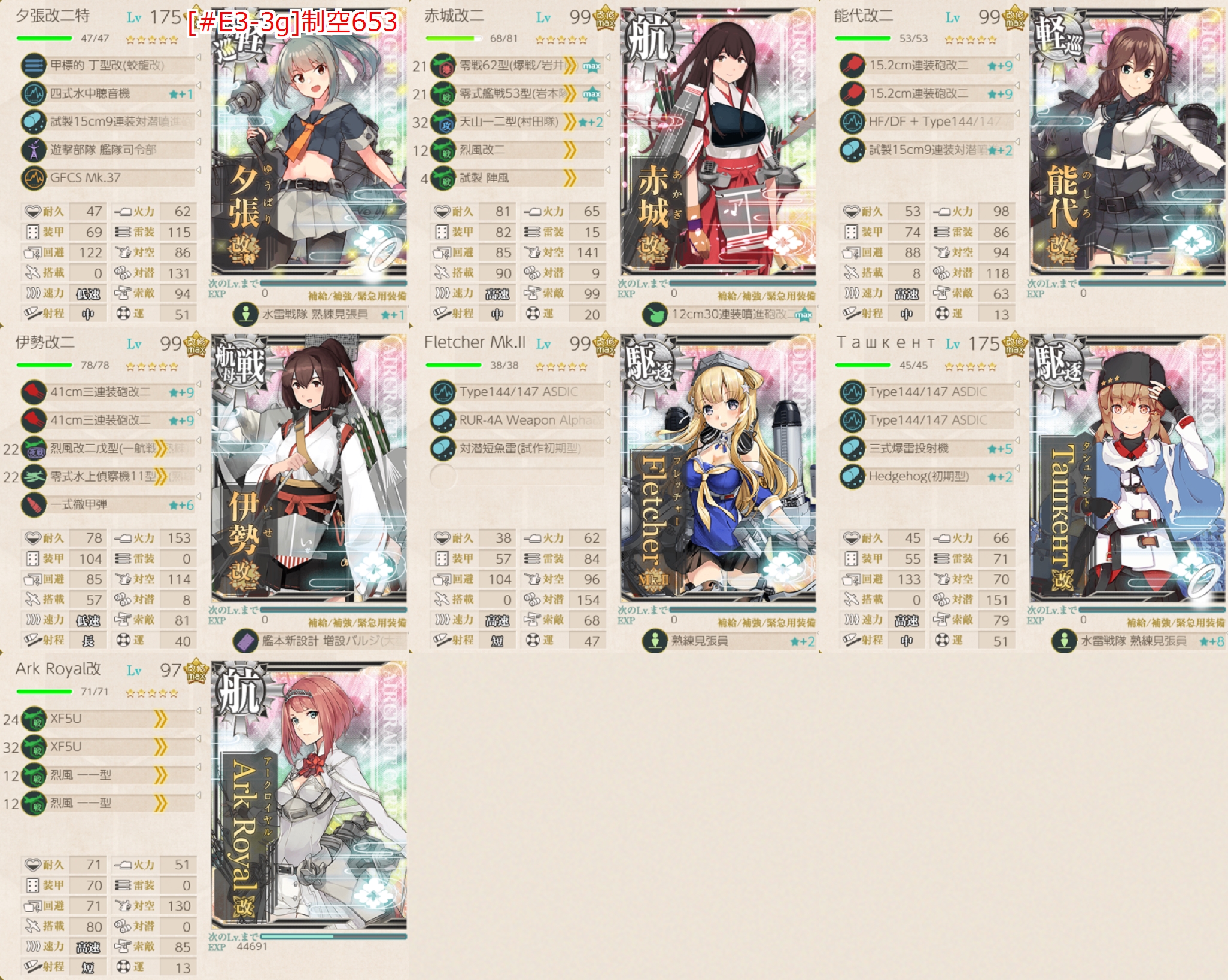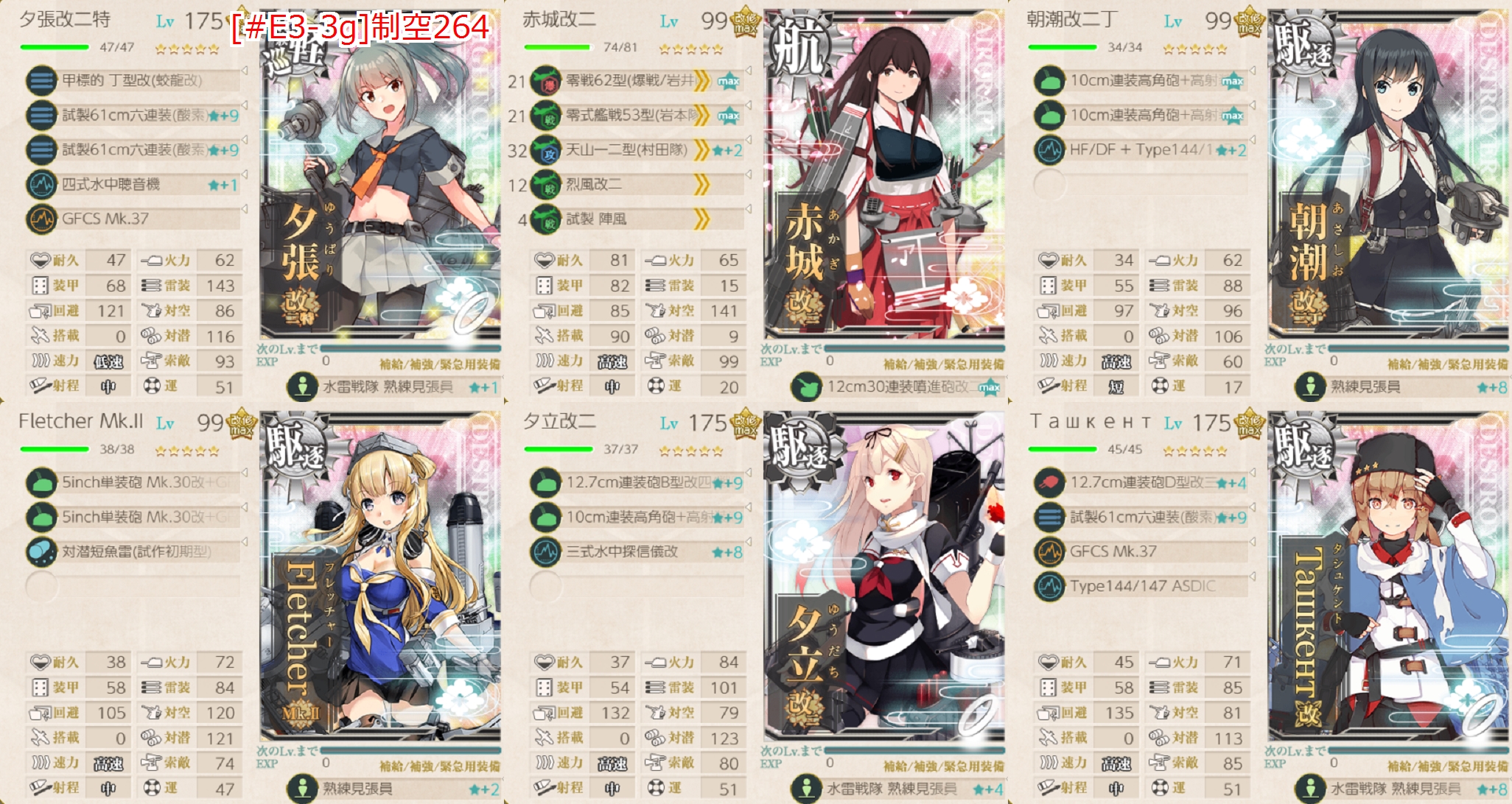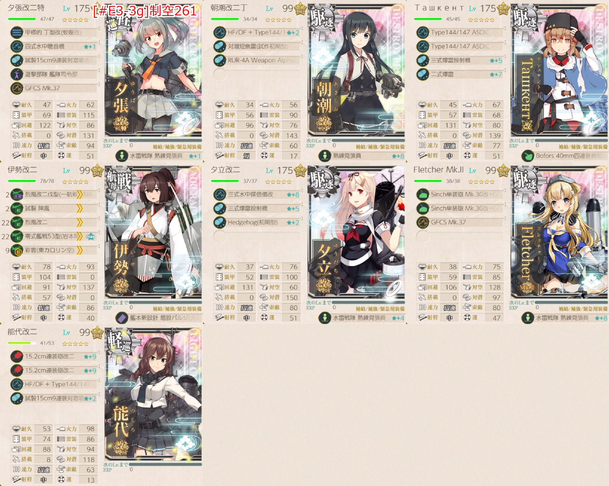 もし対潜火力が足らないようなら「能代」枠の軽巡も対潜装備×4にしたり「Fletcher」枠にも対潜装備かな?