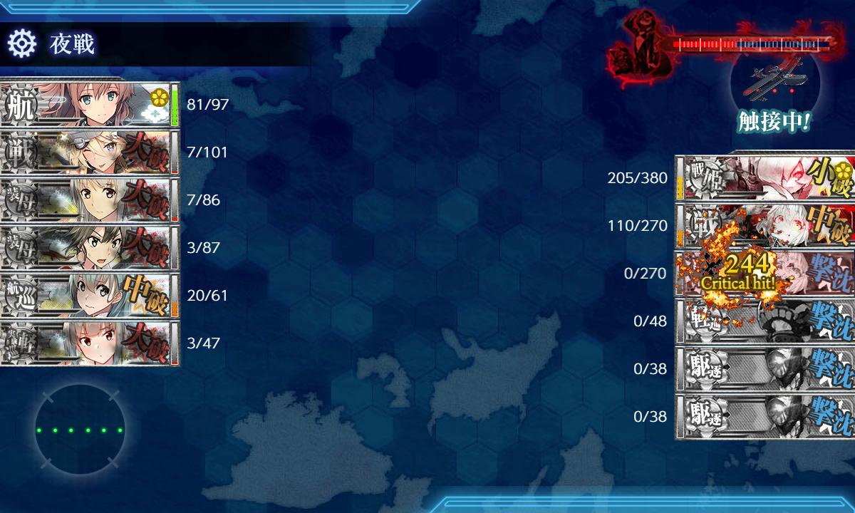 こちらも大分被弾しちゃいましたが昼戦で南方棲戦姫だけ出来たのでなんとか撃破 最後は夕張。