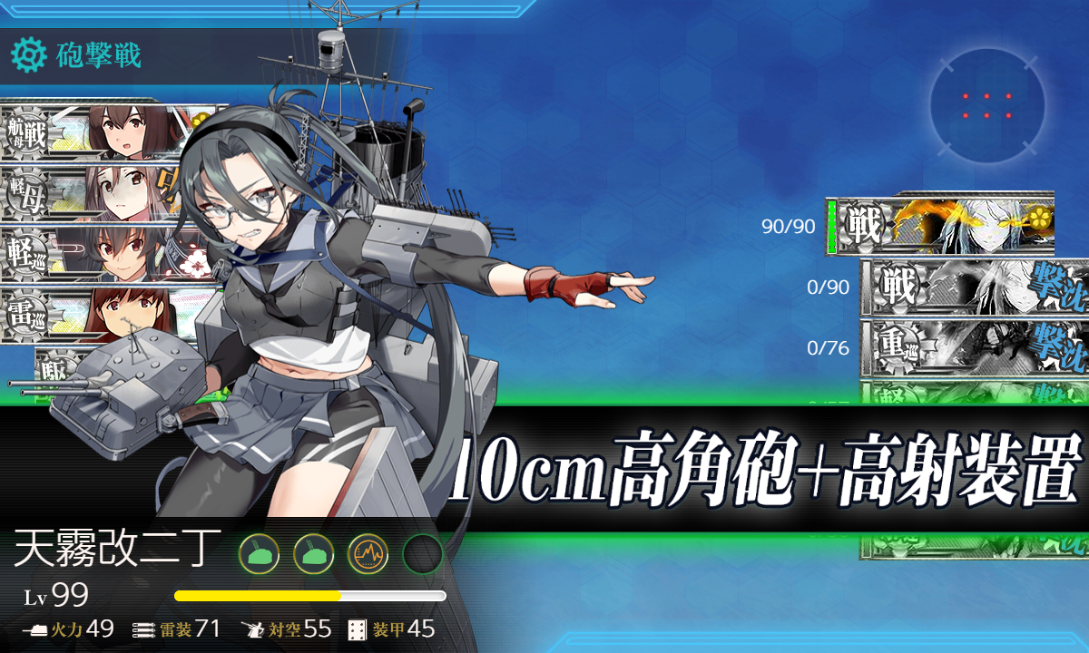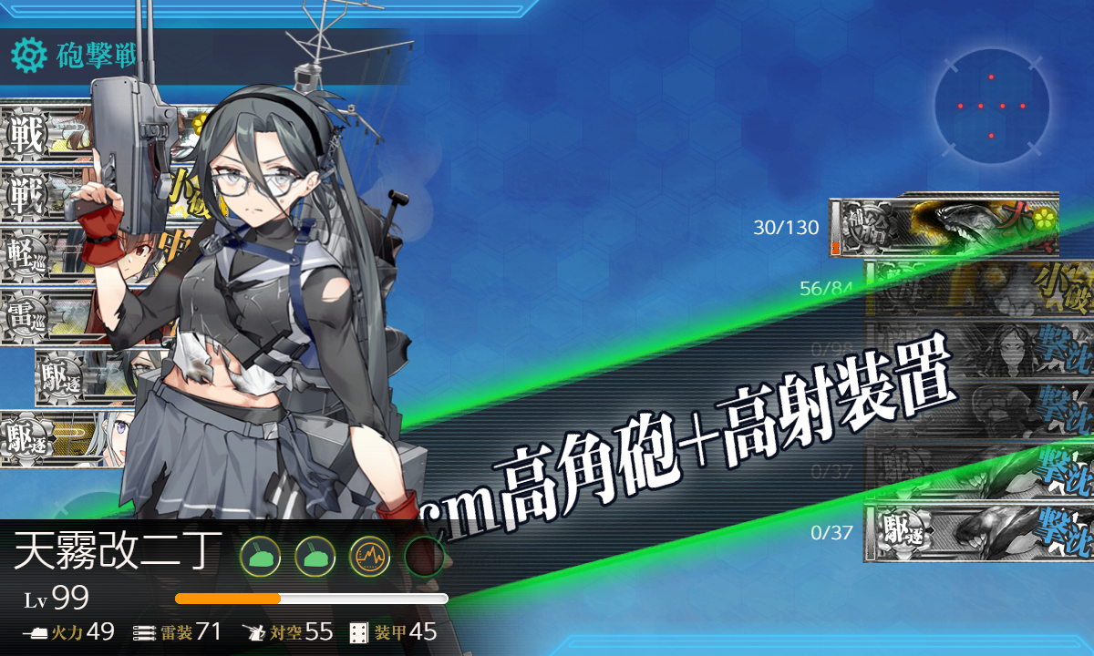 私は[#7-3-2]で被弾したので次の[#5-1]から「天霧改二丁」になってます。基本的に"特二式内火艇"等の対地装備が搭載出来る「天霧改二丁」の方が便利というか使い勝手が良いはずなので「山風」同様に改二丁での運用が主流になるはず。