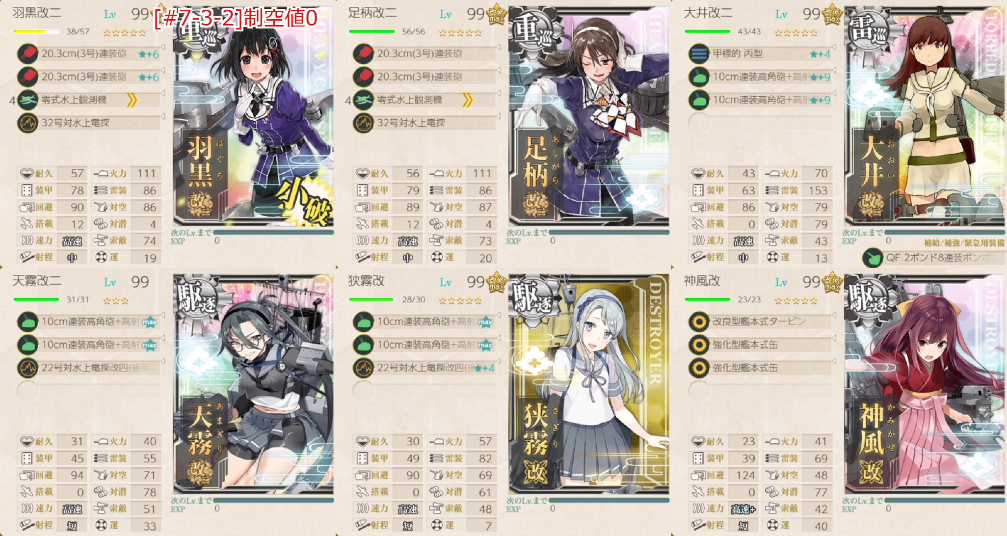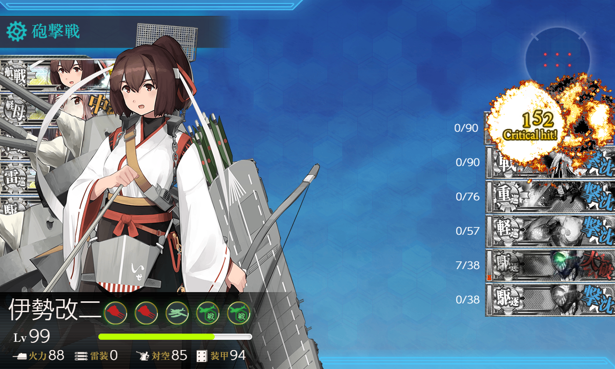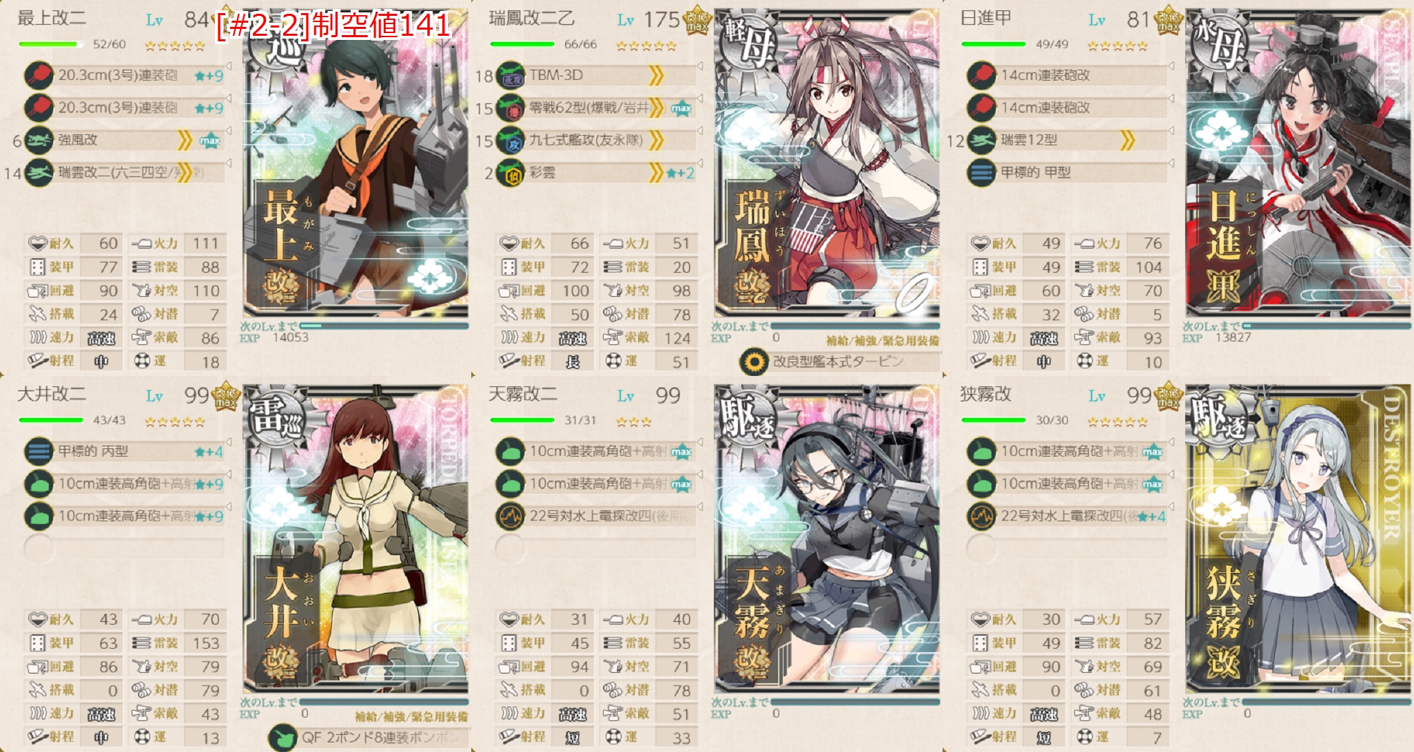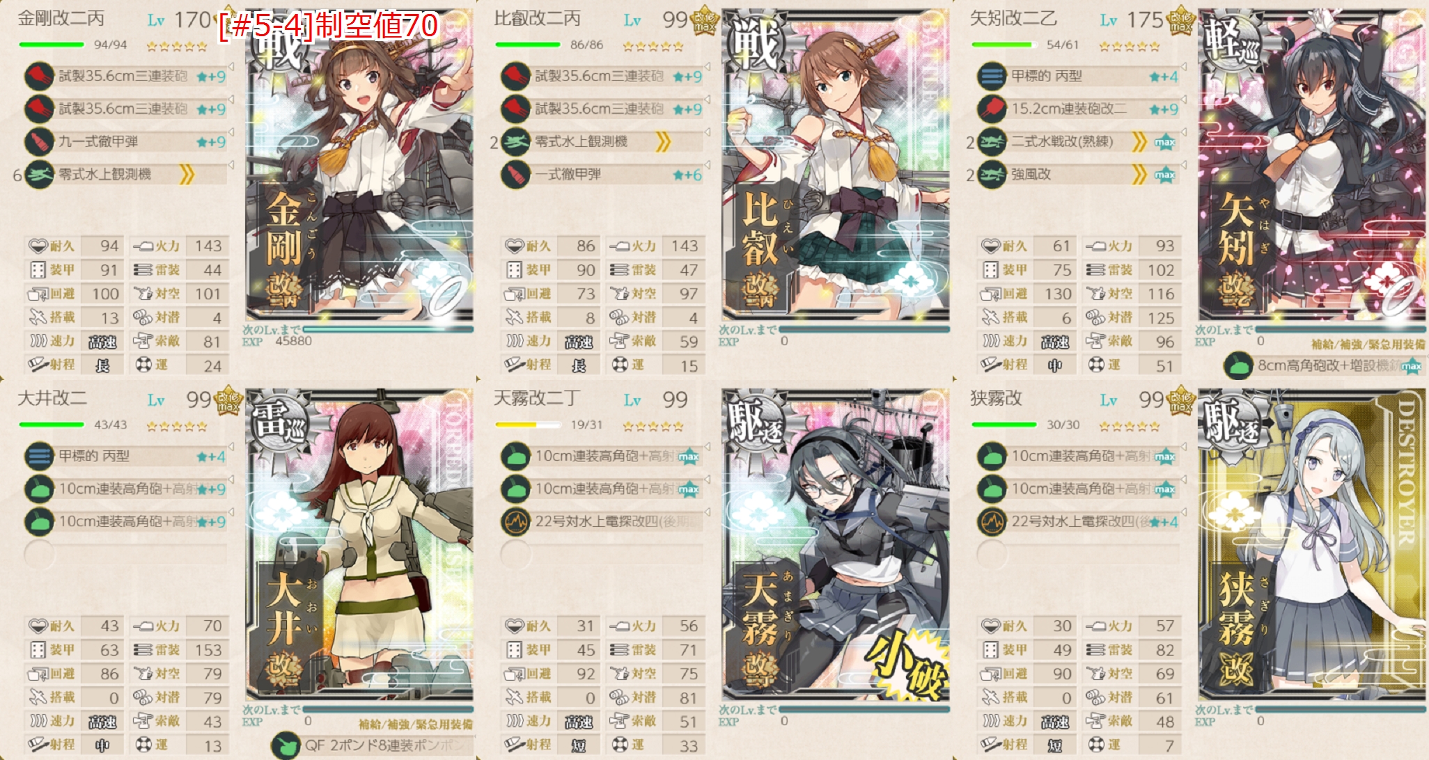- 制空値&索敵値 制空値はボス戦時140↑あれば航空優勢になるんですがそこまで稼ぐには「伊勢/日向」とかにしないと厳しいので制空値63↑の航空拮抗に合わせてあります。と言っても正直ボス編成は大したことないので制空権喪失でも問題ないはず。