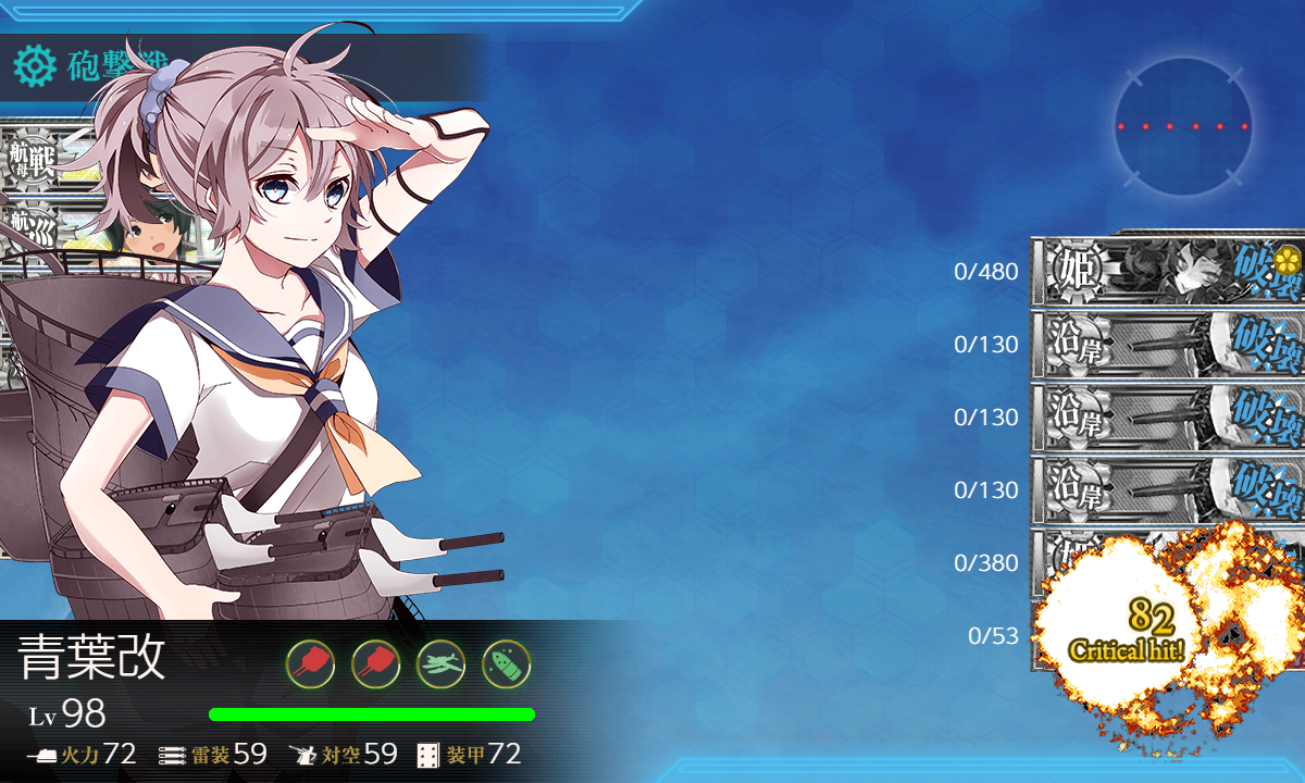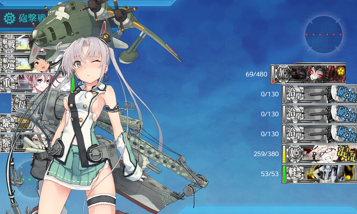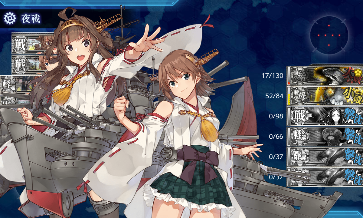 いつもは「大井」→"駆逐"で最短√なんですがその√は通れず渦潮経由になるので"電探"搭載を忘れずに。