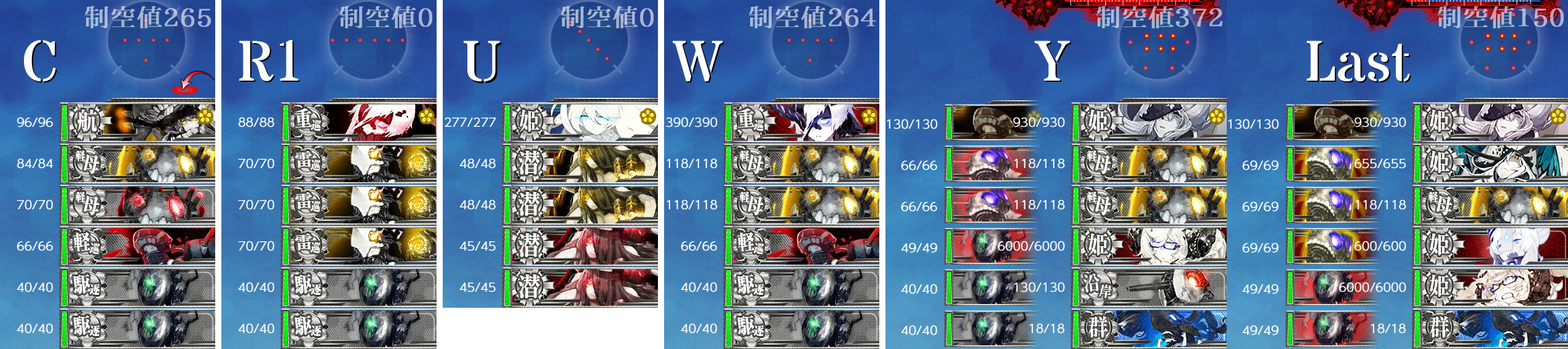 1戦目(C)は航空拮抗(187↑)で充分、4戦目(W)が航空拮抗(177↑)になるのがちょっと気になりますがボス(Y)火力重視。