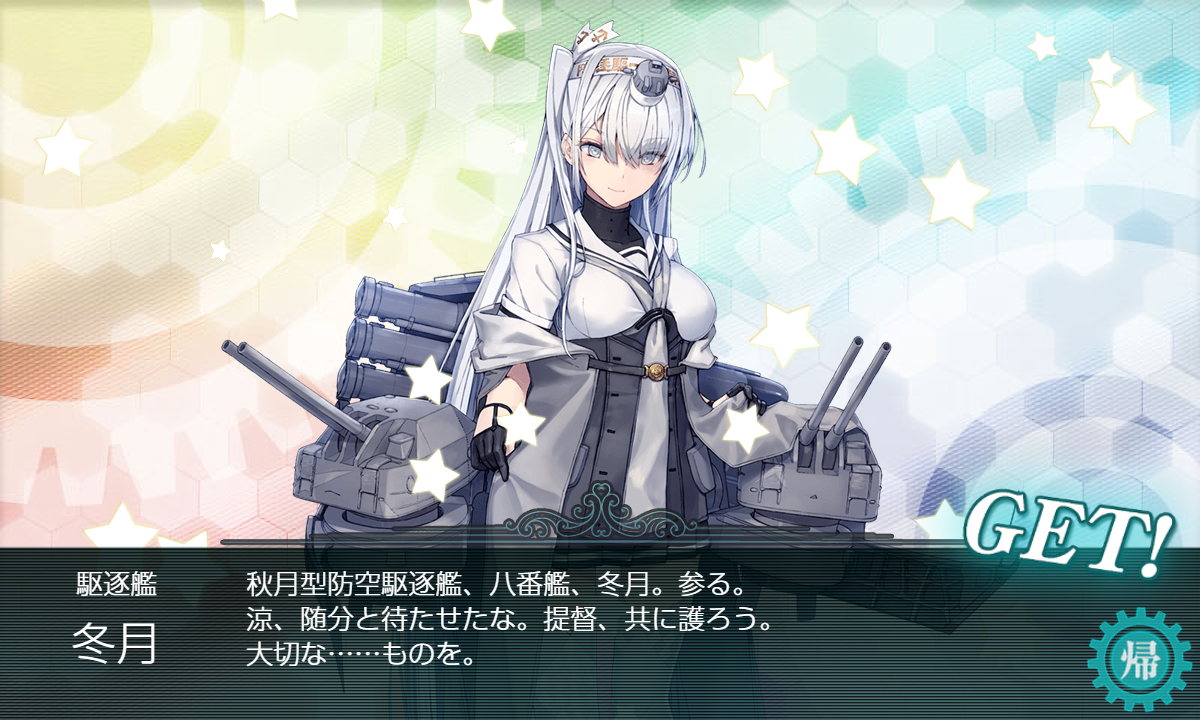 クリア後に武蔵大和を長門陸奥と入れ替えて出撃し、ボスと再戦しましたが、特殊砲撃はPTに3発中2発吸われました( ;∀;)(しかもミス)…それでも何とか昼戦で終了、ドロップは涼月でした。