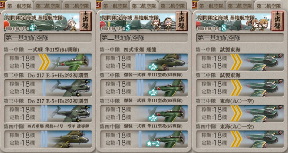 基地航空隊,(決戦支援),先制雷撃で相手の第二艦隊をなるべく落としてこちらの火力艦を守ることが最重要でしょうか。