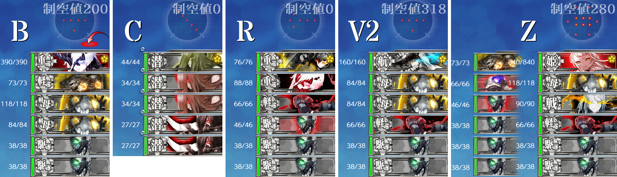 ただ正直1戦目(B)も航空優勢↑で充分なので"航巡"→"戦艦/重巡/軽巡"等々にして水戦なしの制空値500程度でもok。