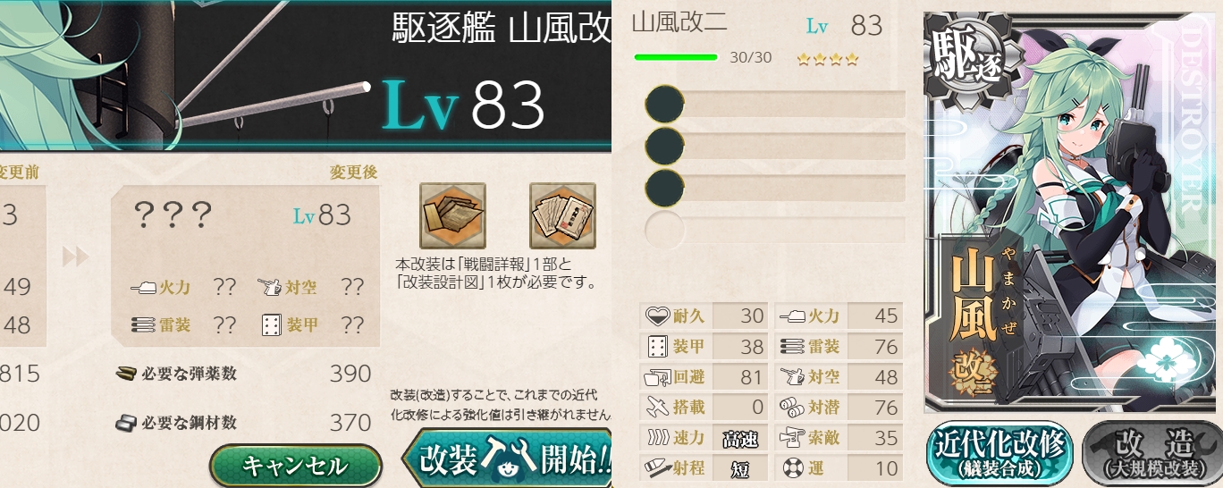 ちまちま育てていた2人目の「山風」が83Lvになったので改二にしちゃいました₍₍ (ง ˘ω˘ )ว ⁾⁾