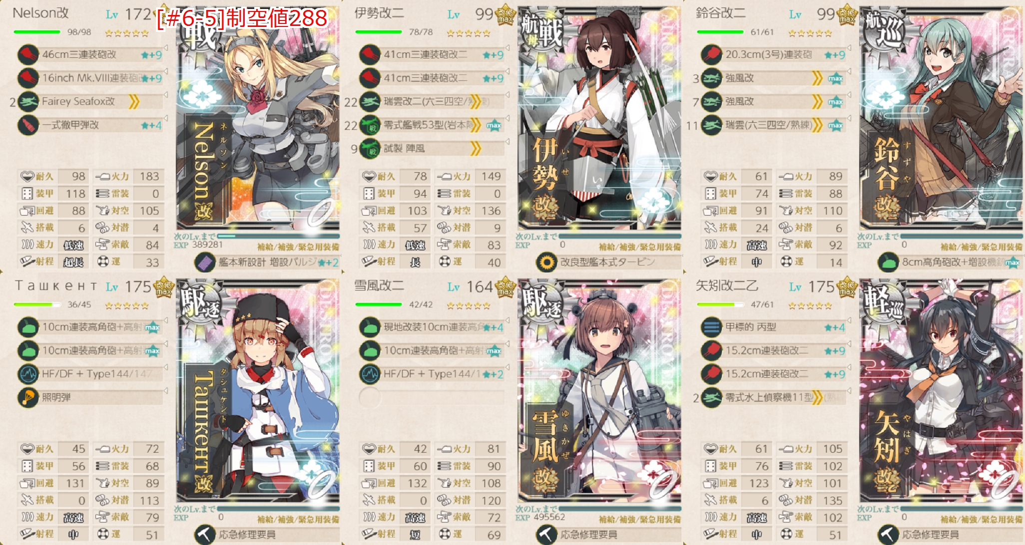 今月の[#6-5]はこんな感じでした。今月は「Nelson」が活躍してたかな?昼戦で終わってる時は大体「Nelson」が良い火力を出していた気がします。出撃5回目とかも直前に「Nelson」が250damageとか出していたはず(・◇・)
