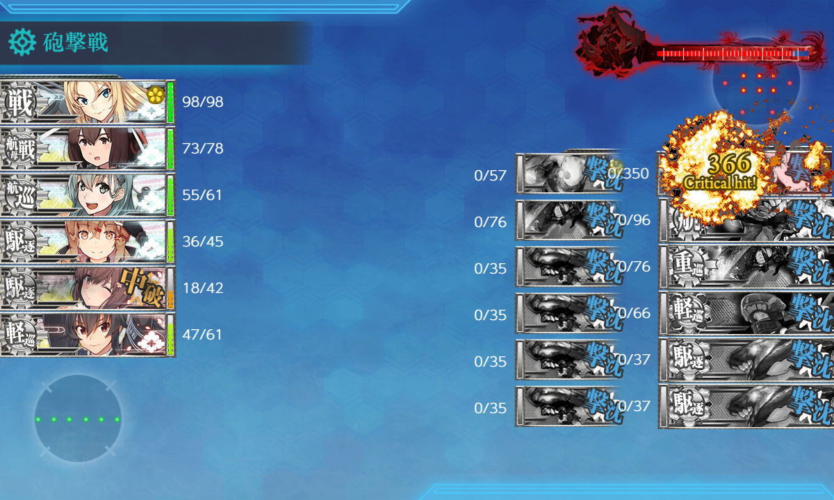 航空戦で3damage受けてТашкентが小破しちゃいましたがそれぐらいで昼戦END 最後はNelson。