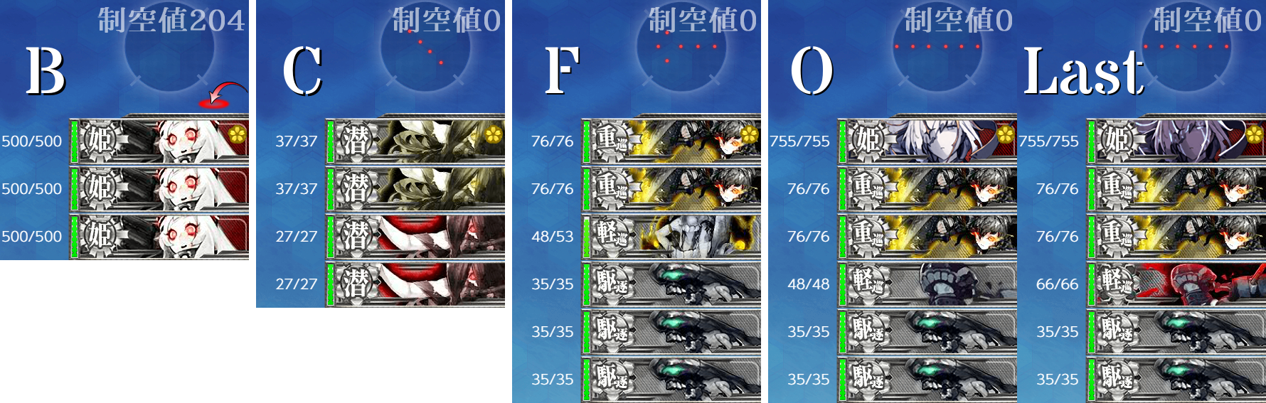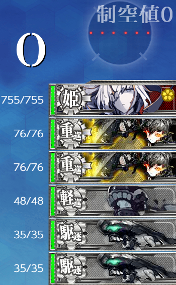 あまりにも何度もボス前の水上艦マスで駆逐艦が大破するので、ボスに送っていた航空隊を全てそちらに回しました(空襲や潜水艦で事故らなければボスにほぼ小破以下で着けるので、乙ならばA勝利はできました)。