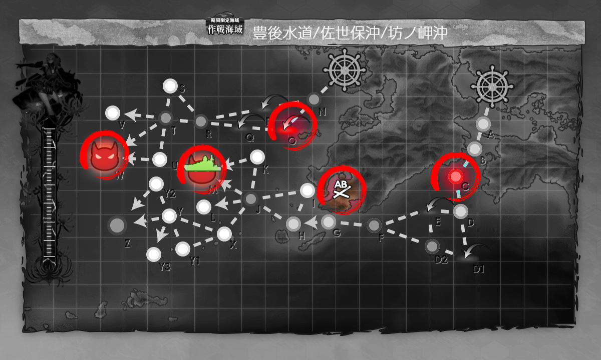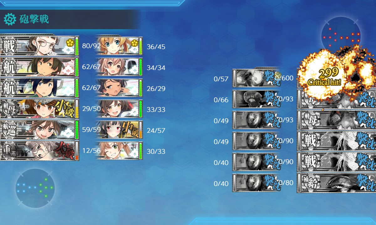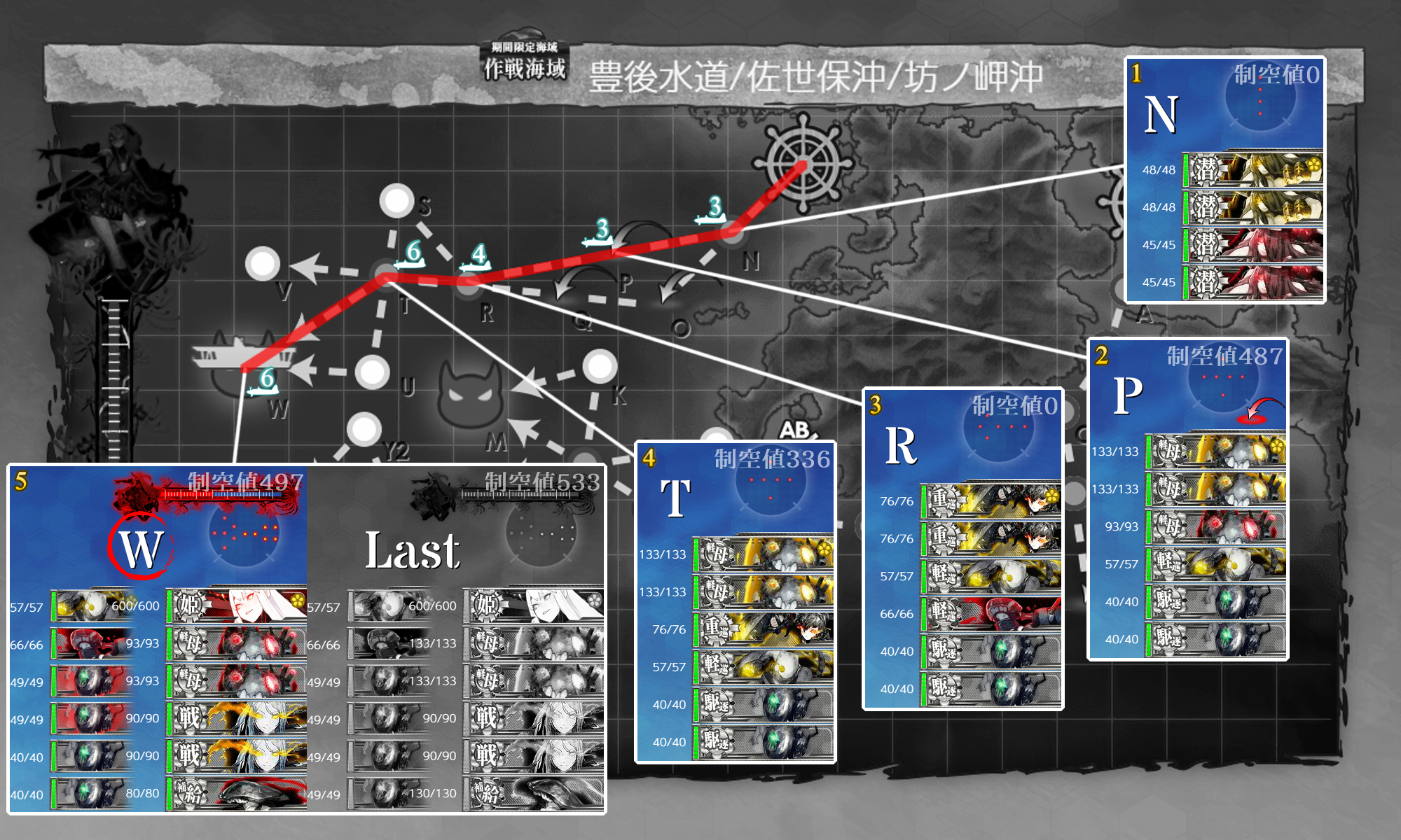 2022年06月18日 23:00 2022春イベ #E4-3甲 海域拡張【豊後水道を抜けて】 カテゴリ:onlineGAME艦隊これくしょん コメント数:コメント(6) #E4-3甲海域拡張さて[#E4]もゴールが見えてきましたが[#E4-3]を攻略しやすくするためにまずは海域拡張(。・Д・)ゞ Wマス(#E4-2boss)A勝利↑?Oマス航空優勢↑CマスS勝利Mマス(#E4-1boss)A勝利↑?【空襲】を航空優勢↑で迎撃×2条件は恐らくこんな感じ。"W,Mマス"両方ともS勝利が取れちゃったのでちょっと怪しいですがA勝利で大丈夫なはず。 手順1手順2手順3海域拡張←Click切替 WマスA勝利↑+【空襲】を航空優勢↑で迎撃 まずは『WマスA勝利↑』。[#E4-2]本攻略とほぼ同じことをするだけ。あと『【空襲】を航空優勢↑で迎撃』も。 【空襲】迎撃用に基地航空隊を2部隊【防空】にしますがA勝利で良いので問題はないはず。 編成(空母機動部隊)/お札:[機動部隊別働隊]▼Click 編成基本的にはそのままですが「Pola」に"水戦"を増やして制空値を稼いでます。 サブ「Roma」「飛龍」「蒼龍」「利根」「Pola」「阿武隈」「Johnston」。 制空値基地航空隊の削りが2回分になるので出撃時に640ぐらいは必要かな?拮抗でもA勝利なら取れると思いますが。 基地航空隊 第一航空隊:【Wマス】に集中。必要行動半径は【6】[航空劣勢×2] 第二航空隊:【防空】。[航空優勢] 第三航空隊:【防空】。[航空優勢] 【空襲】が新編成になるのでちゃんとした【防空】部隊を2つに。 Oマス航空優勢↑ 次は『Oマス航空優勢↑』。一度やりましたし特に難しい要素はないです。 編成(空母機動部隊)/お札:[機動部隊別働隊]▼Click 編成前と同じで「御蔵」を編成して√制御。 サブ「Roma」「飛龍」「蒼龍」「利根」「Pola」「阿武隈」「Johnston」「御蔵」。 制空値今回は"Oマス"だけで良いので出撃時に制空値520↑もあれば充分。 基地航空隊不要なので【退避】。2マスではまず【空襲】も来ないはず。 CマスS勝利+MマスA勝利↑+【空襲】を航空優勢↑で迎撃 次は『CマスS勝利』+『MマスA勝利↑』。[#E4-1]でやったのとほぼ同じなので特に問題ないはず。 あとは2回目の『【空襲】を航空優勢↑で迎撃』も。【空襲】迎撃が残った場合は潜水艦単艦で出撃するのもあり。 編成(遊撃部隊)/お札:[呉防備戦隊]▼Click 編成[#E4-1]の時とほぼ同じ。 サブ「筑摩」「照月」「木曾」「Jervis」。 制空値航巡1人では航空拮抗も無理なので無視。 基地航空隊 第一航空隊:【Mマス】に集中。必要行動半径は【4】[航空劣勢×2] 第二航空隊:【防空】。[航空優勢] 第三航空隊:【防空】。[航空優勢] 海域拡張ちょっと分かりにくいですが2本のショートカット√が開通して[#E4-3]が攻略しやすくなりました(。・Д・)ゞ タグ :#艦これ#艦これイベント#2022春梅雨イベント#後段作戦#海域拡張 艦隊これくしょん(艦これ)ランキングに参加しています。クリックして頂けると励みになります(。・Д・)ゞ 「onlineGAME」カテゴリの最新記事 コメント コメント一覧 (6) 1. 阿武隈提督 2022年06月23日 20:49 お疲れ様です('◇')ゞ もう必要ないとは思いますが一応。 WマスA勝利、MマスS勝利、その他記事の条件通りでショートカット開通を確認しました。 0 naru がしました 2. naru 2022年06月24日 02:55 >>1 色々な情報でA勝利でも大丈夫というのは色々見てはいたんですが今回ここがS勝利指定なの?というのもいくつかあるので一応そのまま表記した感じですねー(・◇・) 0 naru がしました 3. ブルネイ提督の通りすがり 2022年06月26日 15:45 お疲れ様です。ルート短縮ギミック完了です。これやらないとEの空襲戦、Jのヌ級Ⅱ型カット 出来ないので厄介です。やることは難しくないですがこういった時間泥棒は嫌いですね。本当 E-5-2までギミックがあるので面倒です。基地空襲は2~3戦しないと出ないのも面倒でした。 ちなみにどちらもボスA勝利でOKです。 0 naru がしました 4. naru 2022年06月28日 21:18 >>3 ギミックに関してはそういう設計っぽいのでしょうがないですかねー。 あとは結局この手の話はどういったバランスが適正かは人それぞれ感じ方が違いますし極論すると1回でクリア出来るように的な意見もあるでしょうし自分が合わせるしかないですねー_(:3 」∠ )_ 0 naru がしました 5. ブルネイから定点観測者 2022年07月08日 15:26 お疲れ様です 毎回イベント攻略の参考にさせていただいております ルート短縮ギミックのチェック4箇所を回っても基地航空優勢2回が達成できなかったため、記事中にあった 【空襲】迎撃が残った場合は潜水艦単艦で出撃するのもあり。を実践してみたのですが、潜水艦1隻ではD1マスで爆撃にあい、あえなく大破してしまい周回は不利ですので他の艦隊構成をおすすめすることを御報告しておきます。 空母2隻と先制対潜艦5隻に切り替えて周回中ですが今だ達成できていませんが頑張ります 0 naru がしました 6. naru 2022年07月13日 18:46 >>5 確か1回やってみて何とかなったと思ったんですが今回似たようなところが多いのでどこかと記憶が混同しているのかも……。 基本的に同時進行出来るものは同時進行しているのでその辺