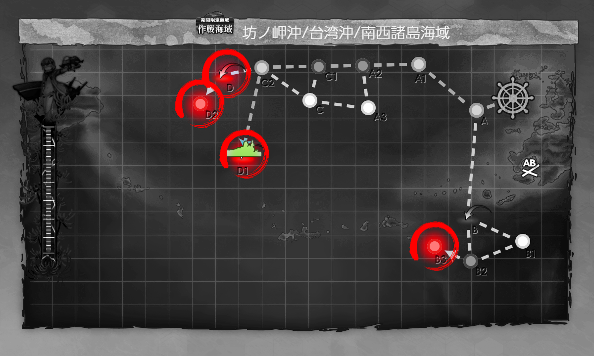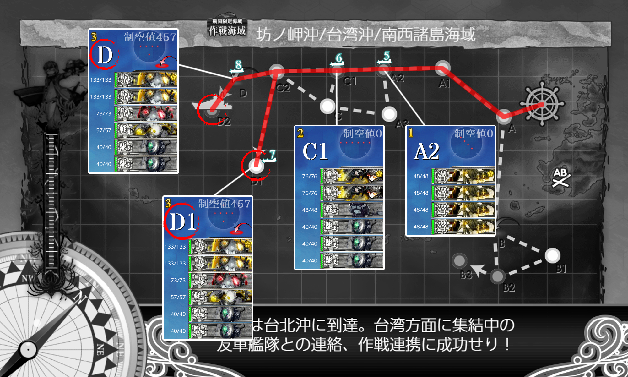 D1マス到達&航空優勢はD1に陸戦3、A2に試製東海。道中警戒陣でいけますね。ただD1が