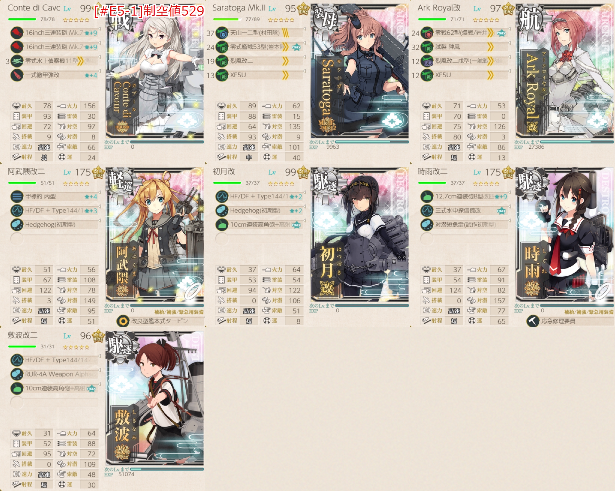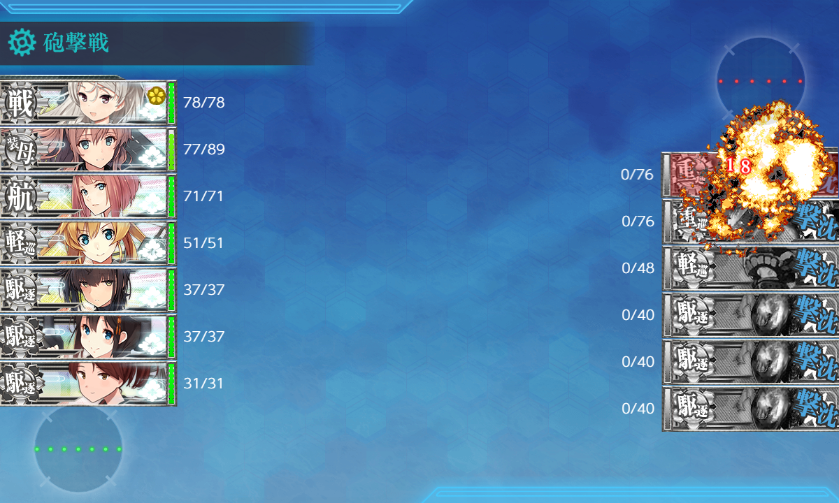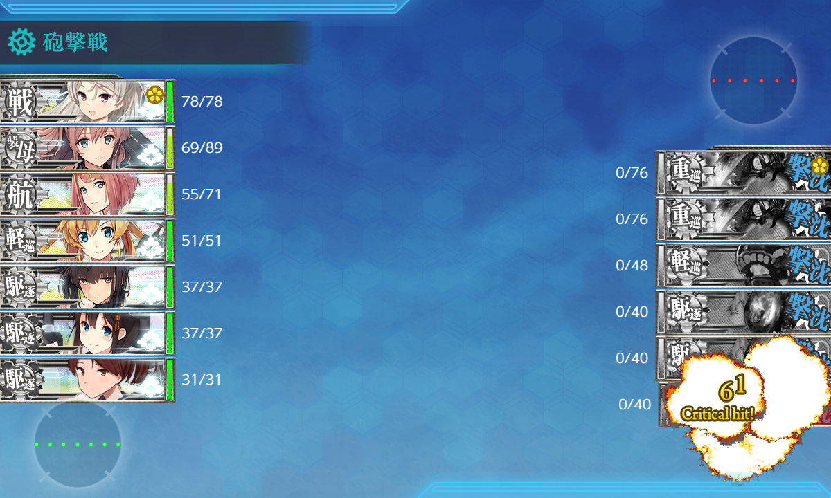 2022年06月19日 20:39 2022春イベ #E5-1甲 海域拡張【血戦!異聞坊ノ岬沖海戦】 カテゴリ:onlineGAME艦隊これくしょん コメント数:コメント(2) #E5-1甲海域拡張さてさて今イベント最後の[#E5]もまずは海域拡張から(。・Д・)ゞ特に難しいものはないです。 B3マスS勝利×2Dマス航空優勢↑?D2マス到達D1マス航空優勢↑?(D1マス到達?)条件は恐らくこんな感じ。現時点でのマップ最奥にいくだけですが"B3マス"が2回というのは何か元ネタがありそう。 手順1手順2海域拡張←Click切替 B3マスS勝利×2 まずは『B3マスS勝利×2』。潜水艦戦2回(B1,B2)√想定が何故か最短√でしたが問題はないので良し。 編成(遊撃部隊)/お札:[佐世保配備艦隊]▼Click 編成先に[#E5-1]攻略編成を考えてほぼそれをそのまま流用した形。 サブ「Saratoga」「初月」。 制空値"B3マス"には制空値を持つ敵がいないので道中空中戦(B)で航空拮抗が取れる制空値314↑あれば充分。 基地航空隊不要なので【退避】とか【防空】で。次の手順では使います。 D/D1マス航空優勢↑+D1/D2マス到達 次は『Dマス航空優勢↑』+『D2マス到達』+『D1マス航空優勢↑』。 ちょっと条件があやふやですが空襲戦で航空優勢↑を取れば確実なはず。 編成(遊撃部隊)/お札:[佐世保配備艦隊]▼Click 編成能動分岐を変えるだけなので編成/装備は一緒。 というか"空母"の艦載機とかはこっちの制空値に合わせてあります。 サブ「Saratoga」「初月」。 制空値"D,D1マス"の編成はどうやら一緒で基地航空隊の削り(拮抗×2)と合わせて制空値500↑もあれば足りるはずです。 基地航空隊 第一航空隊:【退避】。 第二航空隊:【D,D1マス】に集中。必要行動半径は【8,7】[航空拮抗×2] 第三航空隊:【防空】。[航空拮抗] "D2マス"を目指す時は【Dマス】に集中。"D1マス"を目指す時は【D1マス】に集中。 海域拡張これでボスマスとそこに続く航路が出現して[#E5-1]本攻略開始となります(。・Д・)ゞ タグ :#艦これ#艦これイベント#2022春梅雨イベント#後段作戦#海域拡張 艦隊これくしょん(艦これ)ランキングに参加しています。クリックして頂けると励みになります(。・Д・)ゞ 「onlineGAME」カテゴリの最新記事 コメント コメント一覧 (2) 1. ブルネイ提督の通りすがり 2022年06月28日 17:46 お疲れ様です。ルートギミック解除しました。本編メンバー4回出撃なので旗艦ローテするとキラが 取れにくいです。基地は本編と併用しやすくするため試製東海4を1小隊、陸戦3二式大艇を1小隊、 防空で行いました。 B3S勝利は空襲戦Bに陸戦3、B2に試製東海4を送りました。空襲は無傷でしたが B2で試製東海がさぼるので最低1隻は先制対潜あるといいように思います。 D1マス到達&航空優勢はD1に陸戦3、A2に試製東海。道中警戒陣でいけますね。ただD1が 行動半径7、Dが行動半径8あるため二式大艇を使わないと陸戦3のカバーが出来ないので注意です。 では本編攻略に参ります。(`・ω・´)ゞ 0 naru がしました 2. naru 2022年06月28日 22:21 >>1 目的のマスが強い編成ではないので対潜役等々道中重視の編成で充分かなと思います。 空襲戦に送る基地は最初"二式大艇"を考えていたんですが"二式陸偵(熟練)"で"64戦隊"等を送った方が制空値を稼げたのでそっちにした感じですねー(・◇・) 0 naru がしました コメントフォーム 名前 コメント 記事の評価 リセット リセット 顔 星 情報を記憶 コメントを投稿する 2022春イベ #E4-3甲(vs空母棲姫II)【豊後水道を抜けて】2022春イベ #E5-1甲(vsヒ船団棲姫)【血戦!異聞坊ノ岬沖海戦】