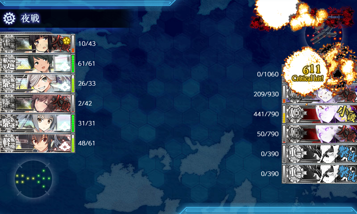 最後は「霞」の魚雷CIで611damage出して撃破₍₍ (ง ˘ω˘ )ว ⁾⁾