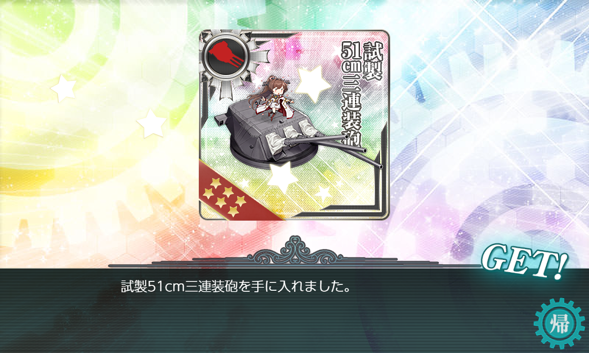 "試製51cm三連装砲"は「武蔵改二」だと回避のマイナスを消しきれませんがそれでも強い主砲ですし出来れば入手したい……ただ難易度は高めなので狙うべきか要考察。友軍艦隊が来援すれば削りや的減らしをしてくれるはずなので大分攻略しやすくなるんじゃないですかねー?恐らく今月末には来援すると思うのでまずはそれを待つのが良い気がします。