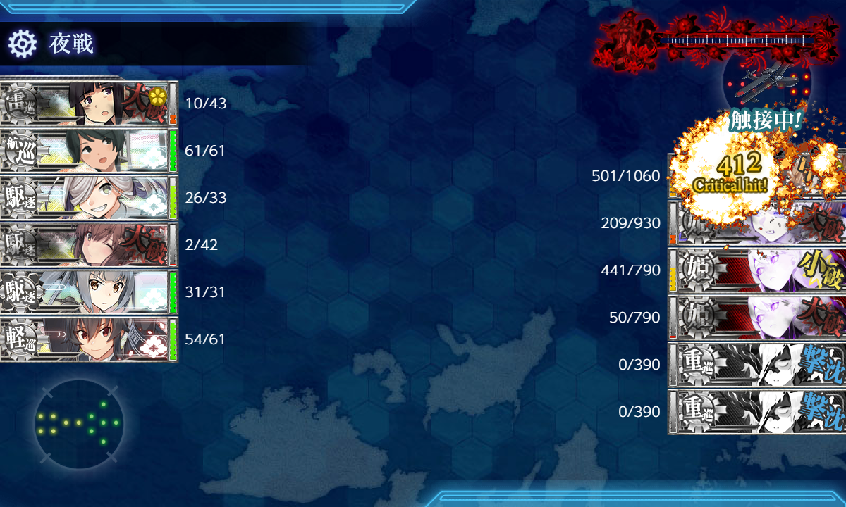 ただ、昼戦唯一の幸運として大和タッチの一発が敵旗艦を直撃し、その一撃で800超のダメージを喰らわしていたので、夜戦突入時点で一撃圏内には持ち込めていました。