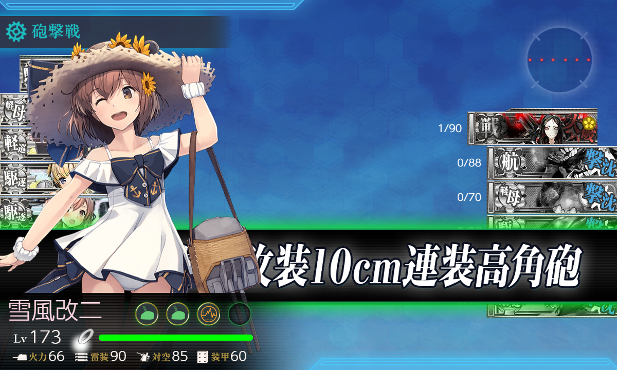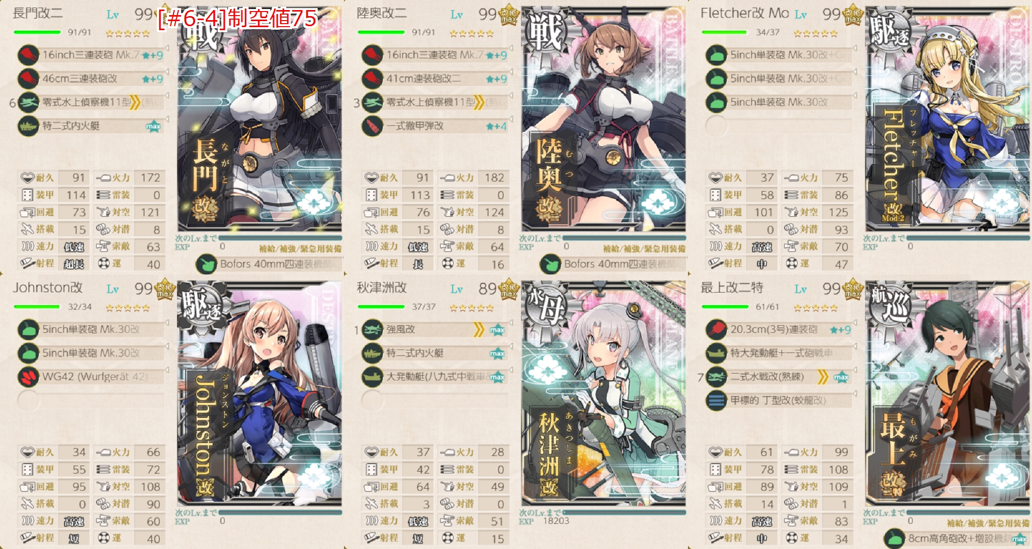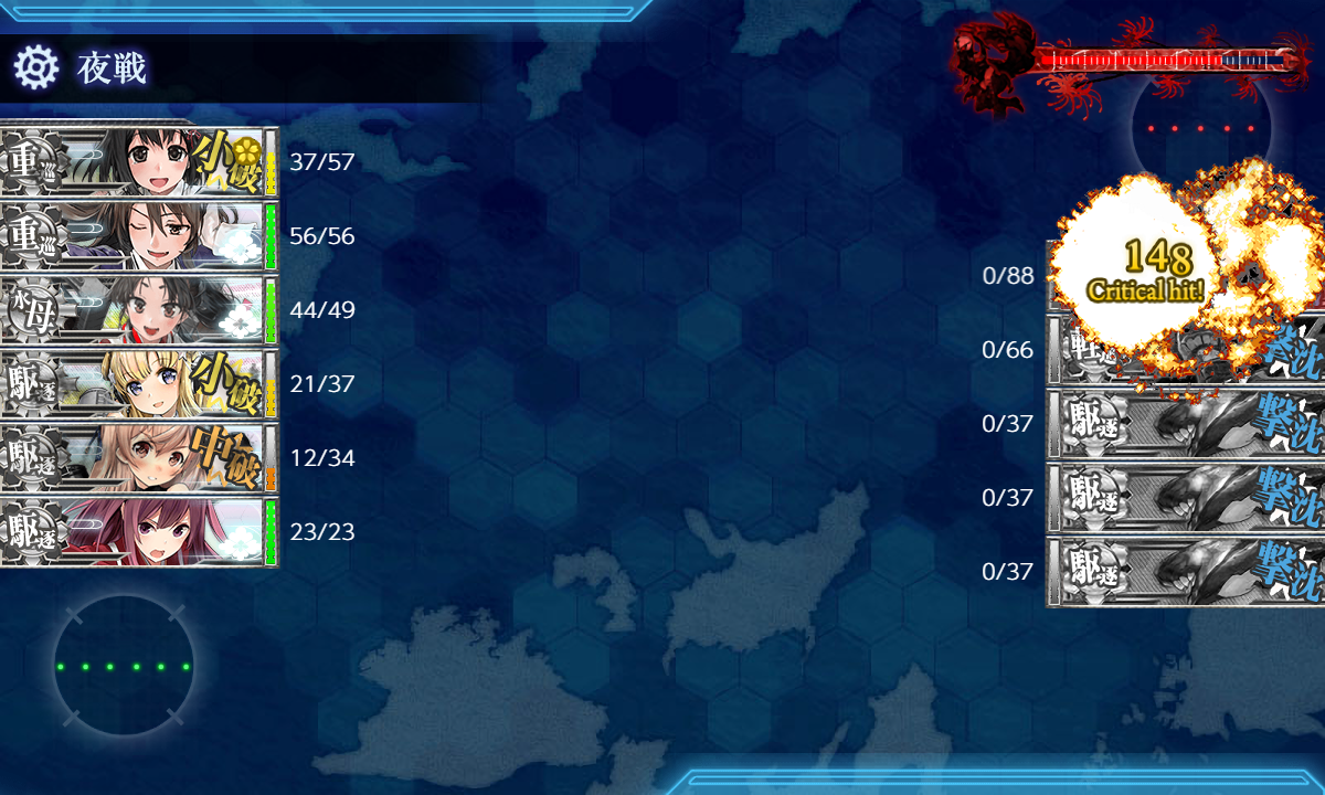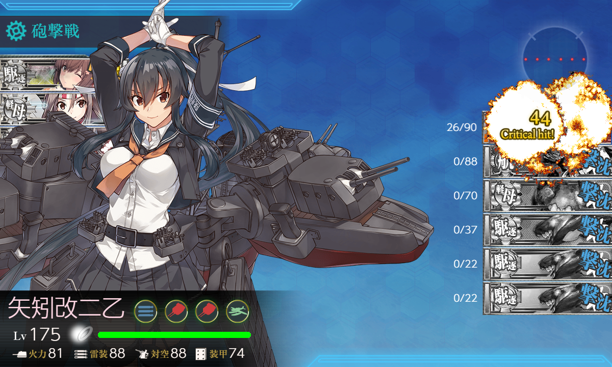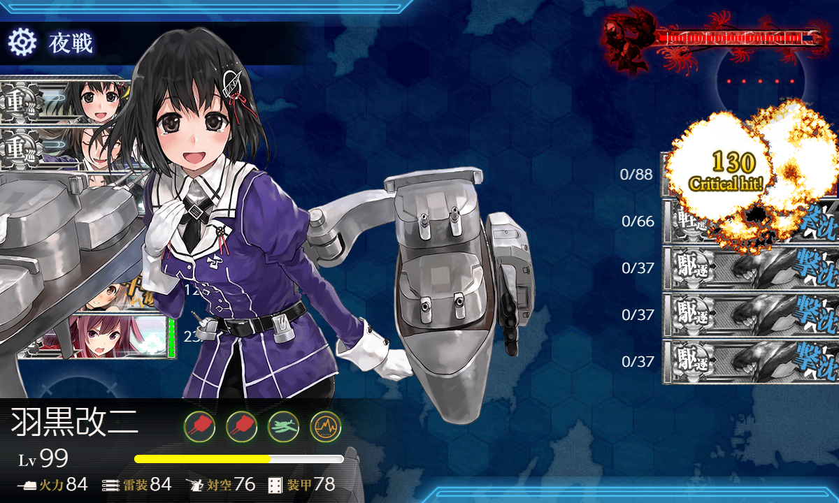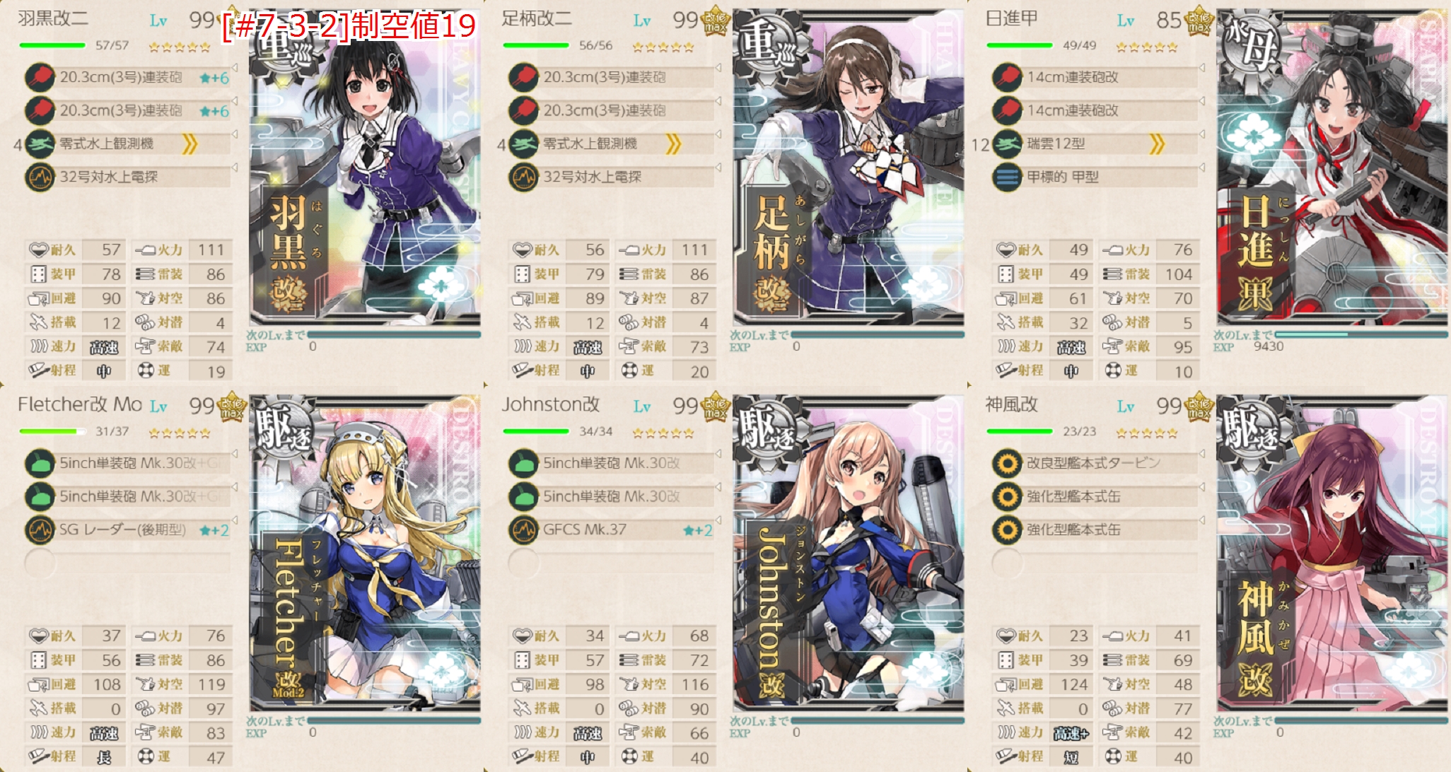 - 編成 「羽黒」「足柄」「神風」で√固定して駆逐枠に「Fletcher,Johnston」を編成しただけ。