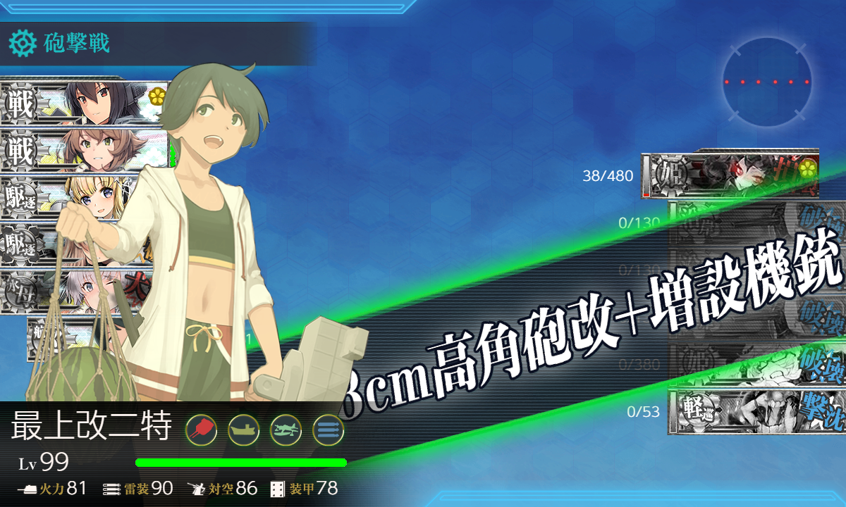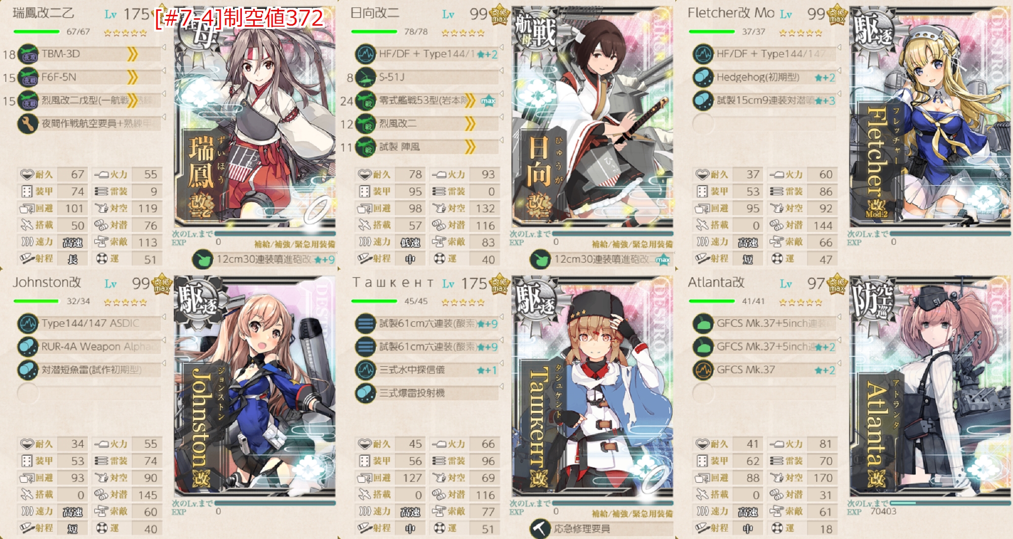 以前もやった基地航空隊なしで安定周回出来る事を目指した編成。道中の空襲戦(E)を航空優勢↑、ボス戦(P)を制空権確保想定ですが航空拮抗,航空優勢で良ければ「日向」に主砲を載せるのもあり。ボス戦で火力不足を感じたら。