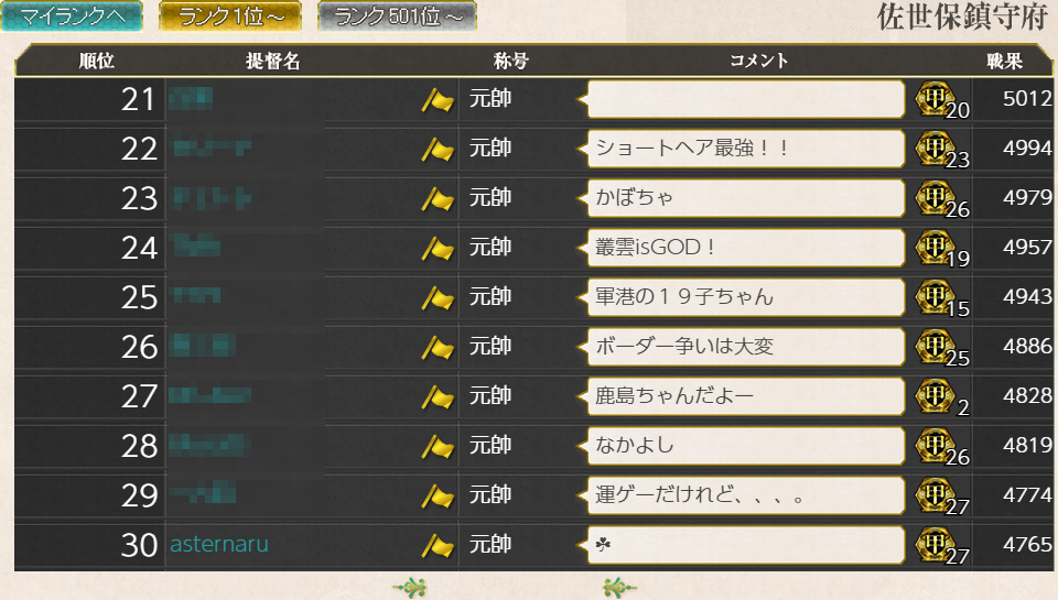 さてさてまだEx海域がいくつか残ってますが戦果拡張任務を全て消化したら久々に30位まで順位が上がりました。