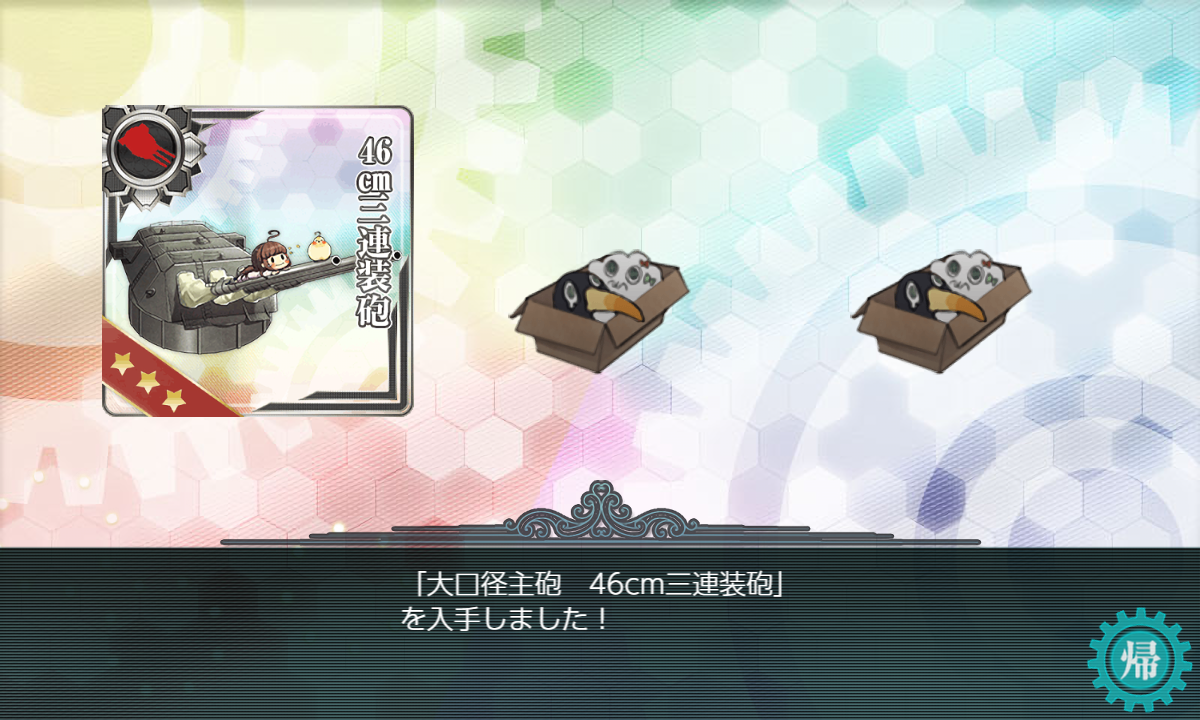 46cm三連装砲は自分の場合あまり出ない印象ですのでイベント前は封印です。本当は46cm三連装砲改★8を★9にしておきたいのですが、誤差だと思えるため今のところは三式水中探信儀改2つ目★MAX用の三式水中探信儀優先です。