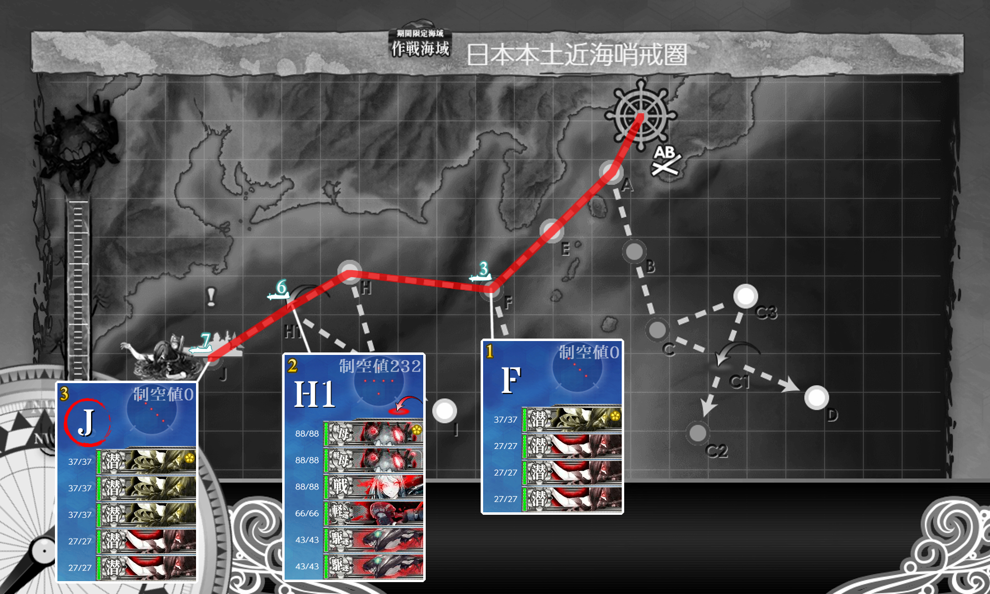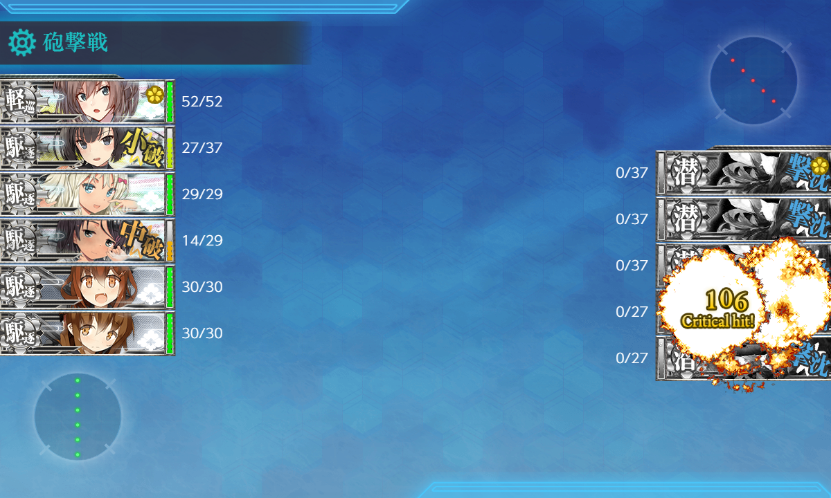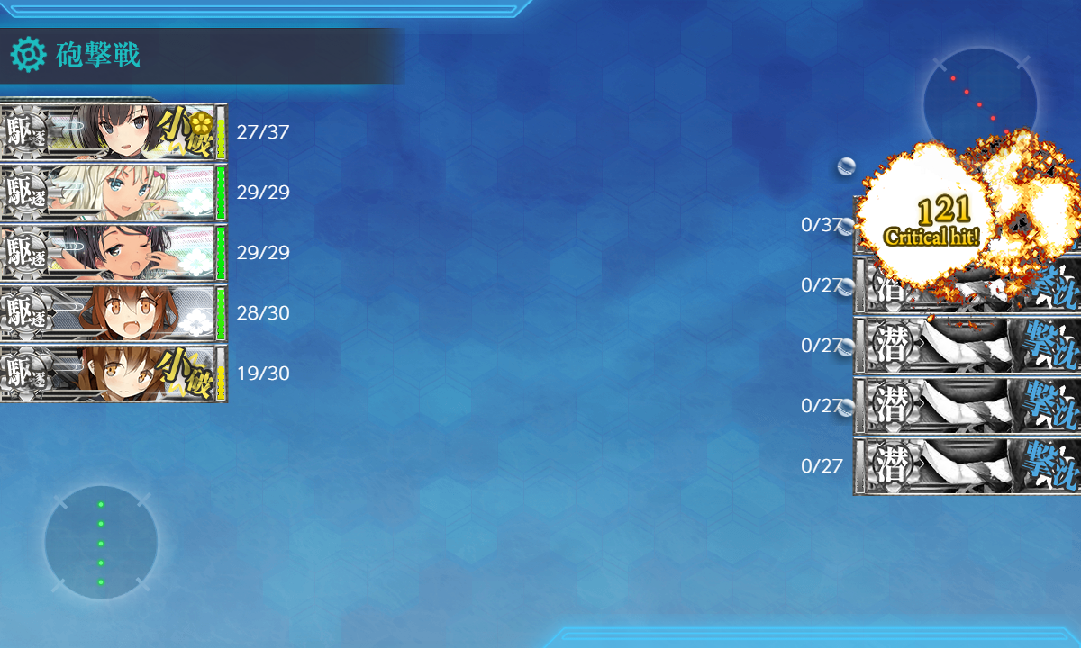 2023年03月01日 14:30 2023早春イベ #E1甲 海域拡張【S21作戦】 カテゴリ:onlineGAME艦隊これくしょん コメント数:コメント(3) #E1甲海域拡張さてさて2023早春イベントが開幕しましたがまずはボスマスがないので海域拡張をしていきます(。・Д・)ゞ C2マスS勝利JマスS勝利G2マスS勝利現時点での最奥マス3箇所に行くだけなので特に難しい点はありません。 手順1手順2手順3海域拡張←Click切替 C2マスS勝利 まずは『C2マスS勝利』。潜水艦相手にS勝利を取るだけなので特筆する点はありません。 編成(通常艦隊)/お札:[横須賀防備戦隊]▼Click 編成特に何の変哲もない水雷戦隊。索敵値が必要かもということで「Sheffield」は対潜+索敵要員。 対潜要員は4人もいれば充分だろうということで「電」は秋月砲×3で防空重視。 サブ「Sheffield」「秋月」「Grecale」 基地航空隊最初から基地航空隊は使えますが海域拡張では不要なので放置。 JマスS勝利 次は『JマスS勝利』。√は違いますがやることは手順1とほぼ一緒。 編成(通常艦隊)/お札:[横須賀防備戦隊]▼Click 編成手順1編成と同じ。 サブ「Sheffield」「秋月」「Grecale」 基地航空隊最初から基地航空隊は使えますが海域拡張では不要なので放置。 G2マスS勝利 最後は『G2マスS勝利』。編成がちょっと変わりますがやること自体はほぼ同じ。 編成(通常艦隊)/お札:[横須賀防備戦隊]▼Click 編成"軽巡"がいると?左√になるようなので手順1,2編成から「Sheffield」を外しただけ。 潜水艦が"カ級"なので装備もそのままですが対潜火力が不安なら「電」も対潜装備にするとか"駆逐/海防"なら増やしても問題ないはずなので"駆逐6"編成にするとか調整して下さい。 サブ「Sheffield」「秋月」「Grecale」 基地航空隊最初から基地航空隊は使えますが海域拡張では不要なので放置。 海域拡張これにてボスマスとそこに続く航路が出現するので[#E1-1]本攻略の開始となります(。・Д・)ゞ 最初から出ているゲージにも描かれていますがボスは"ヌ級改"なのでまぁどうとでもなるでしょう。 タグ :#艦これ#艦これイベント#前段作戦#海域拡張#2023(早)春イベント 艦隊これくしょん(艦これ)ランキングに参加しています。クリックして頂けると励みになります(。・Д・)ゞ 「onlineGAME」カテゴリの最新記事 コメント コメント一覧 (3) 1. ブルネイ提督の通りすがり 2023年03月07日 17:33 お疲れ様です。難易度甲ボスマス&ルートギミック解除完了です。最初空襲戦で軽空母なしは大丈夫か?と思いましたが秋月対空カットイン&機銃&2スロ先制対潜で被弾がカスダメ2程度でした。空襲戦が厳しい場合は陸戦4を送るなど工夫するといいかもしれません。Jは軽空母あるとH2へ逸れるので注意ですね。(`・ω・´)ゞ 0 naru がしました 2. カノノノ 2023年03月12日 10:21 今回もお世話になります よろしくお願いします。 0 naru がしました 3. naru 2023年03月14日 21:41 >>1 制空値を稼げるに越したことはないと思いますがどうしようもない場合もありますしただの"ヌ級"ならまぁ何とか。 >>2 参考になれば幸いです(。・Д・)ゞ 0 naru がしました コメントフォーム 名前 コメント 記事の評価 リセット リセット 顔 星 情報を記憶 コメントを投稿する 2/28(火),3/1(水)アップデートまとめ【絶対防衛線!「小笠原兵団」救援】2023早春イベ #E1-1甲(vsヌ級改flagship)【S21作戦】