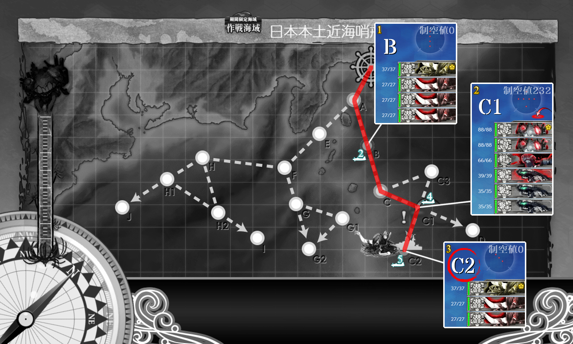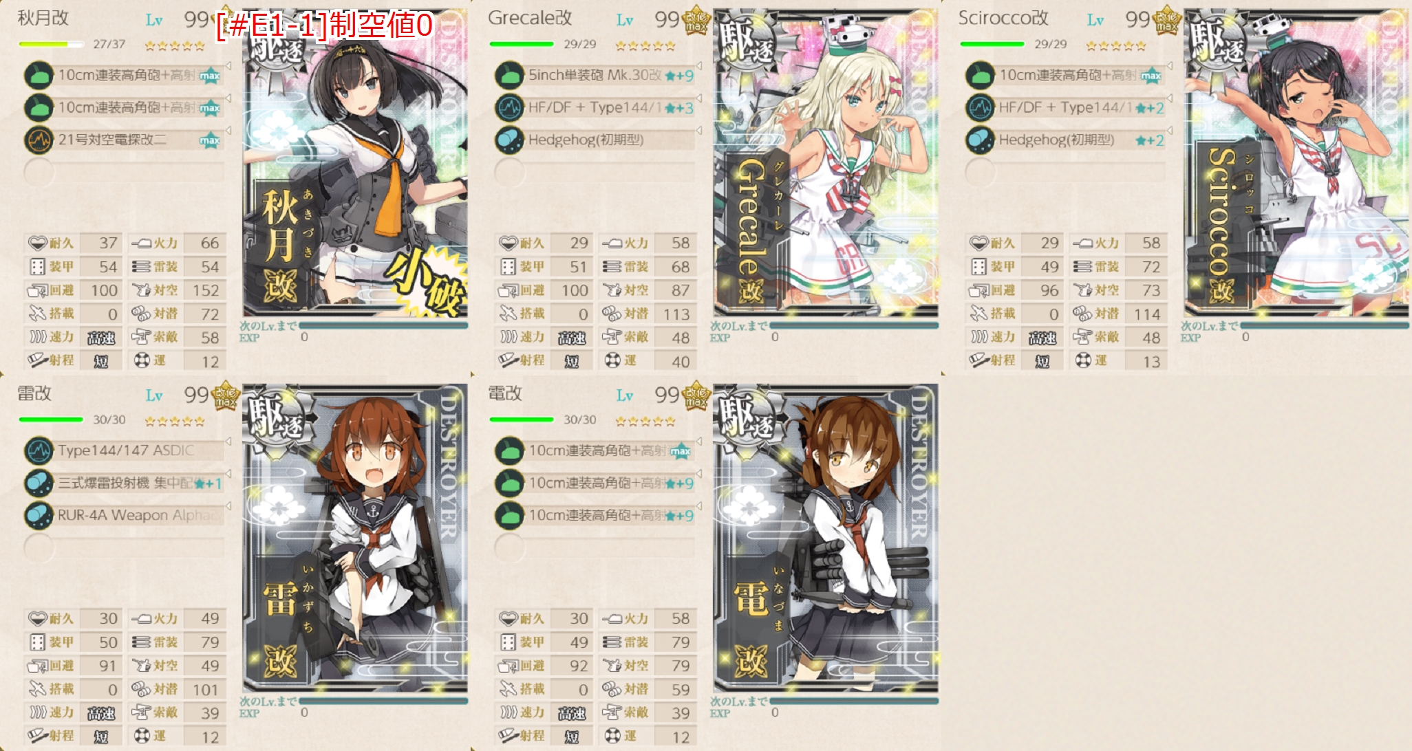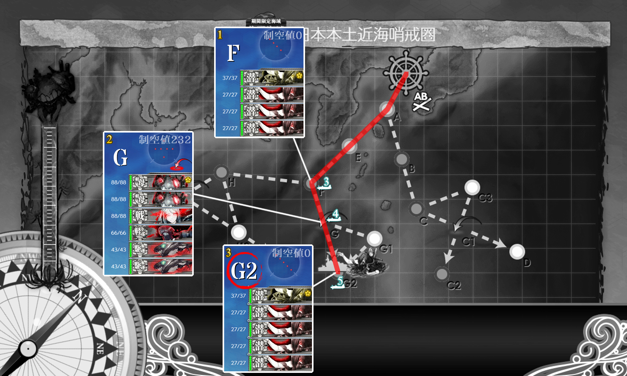 2023年03月01日 14:30 2023早春イベ #E1甲 海域拡張【S21作戦】 カテゴリ:onlineGAME艦隊これくしょん コメント数:コメント(3) #E1甲海域拡張さてさて2023早春イベントが開幕しましたがまずはボスマスがないので海域拡張をしていきます(。・Д・)ゞ C2マスS勝利JマスS勝利G2マスS勝利現時点での最奥マス3箇所に行くだけなので特に難しい点はありません。 手順1手順2手順3海域拡張←Click切替 C2マスS勝利 まずは『C2マスS勝利』。潜水艦相手にS勝利を取るだけなので特筆する点はありません。 編成(通常艦隊)/お札:[横須賀防備戦隊]▼Click 編成特に何の変哲もない水雷戦隊。索敵値が必要かもということで「Sheffield」は対潜+索敵要員。 対潜要員は4人もいれば充分だろうということで「電」は秋月砲×3で防空重視。 サブ「Sheffield」「秋月」「Grecale」 基地航空隊最初から基地航空隊は使えますが海域拡張では不要なので放置。 JマスS勝利 次は『JマスS勝利』。√は違いますがやることは手順1とほぼ一緒。 編成(通常艦隊)/お札:[横須賀防備戦隊]▼Click 編成手順1編成と同じ。 サブ「Sheffield」「秋月」「Grecale」 基地航空隊最初から基地航空隊は使えますが海域拡張では不要なので放置。 G2マスS勝利 最後は『G2マスS勝利』。編成がちょっと変わりますがやること自体はほぼ同じ。 編成(通常艦隊)/お札:[横須賀防備戦隊]▼Click 編成"軽巡"がいると?左√になるようなので手順1,2編成から「Sheffield」を外しただけ。 潜水艦が"カ級"なので装備もそのままですが対潜火力が不安なら「電」も対潜装備にするとか"駆逐/海防"なら増やしても問題ないはずなので"駆逐6"編成にするとか調整して下さい。 サブ「Sheffield」「秋月」「Grecale」 基地航空隊最初から基地航空隊は使えますが海域拡張では不要なので放置。 海域拡張これにてボスマスとそこに続く航路が出現するので[#E1-1]本攻略の開始となります(。・Д・)ゞ 最初から出ているゲージにも描かれていますがボスは"ヌ級改"なのでまぁどうとでもなるでしょう。 タグ :#艦これ#艦これイベント#前段作戦#海域拡張#2023(早)春イベント 艦隊これくしょん(艦これ)ランキングに参加しています。クリックして頂けると励みになります(。・Д・)ゞ 「onlineGAME」カテゴリの最新記事 コメント コメント一覧 (3) 1. ブルネイ提督の通りすがり 2023年03月07日 17:33 お疲れ様です。難易度甲ボスマス&ルートギミック解除完了です。最初空襲戦で軽空母なしは大丈夫か?と思いましたが秋月対空カットイン&機銃&2スロ先制対潜で被弾がカスダメ2程度でした。空襲戦が厳しい場合は陸戦4を送るなど工夫するといいかもしれません。Jは軽空母あるとH2へ逸れるので注意ですね。(`・ω・´)ゞ 0 naru がしました 2. カノノノ 2023年03月12日 10:21 今回もお世話になります よろしくお願いします。 0 naru がしました 3. naru 2023年03月14日 21:41 >>1 制空値を稼げるに越したことはないと思いますがどうしようもない場合もありますしただの"ヌ級"ならまぁ何とか。 >>2 参考になれば幸いです(。・Д・)ゞ 0 naru がしました コメントフォーム 名前 コメント 記事の評価 リセット リセット 顔 星 情報を記憶 コメントを投稿する 2/28(火),3/1(水)アップデートまとめ【絶対防衛線!「小笠原兵団」救援】2023早春イベ #E1-1甲(vsヌ級改flagship)【S21作戦】