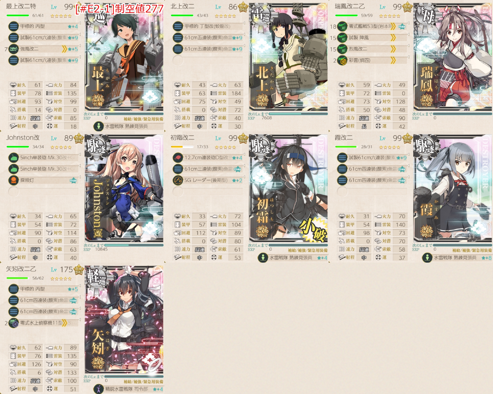 サブ最上(連撃)、サブ北上(魚CI)、初霜(魚CI)、サブジョン(対空+探照灯)、霞(魚CI)、矢矧(魚CI+夜偵)、祥鳳(制空箱)