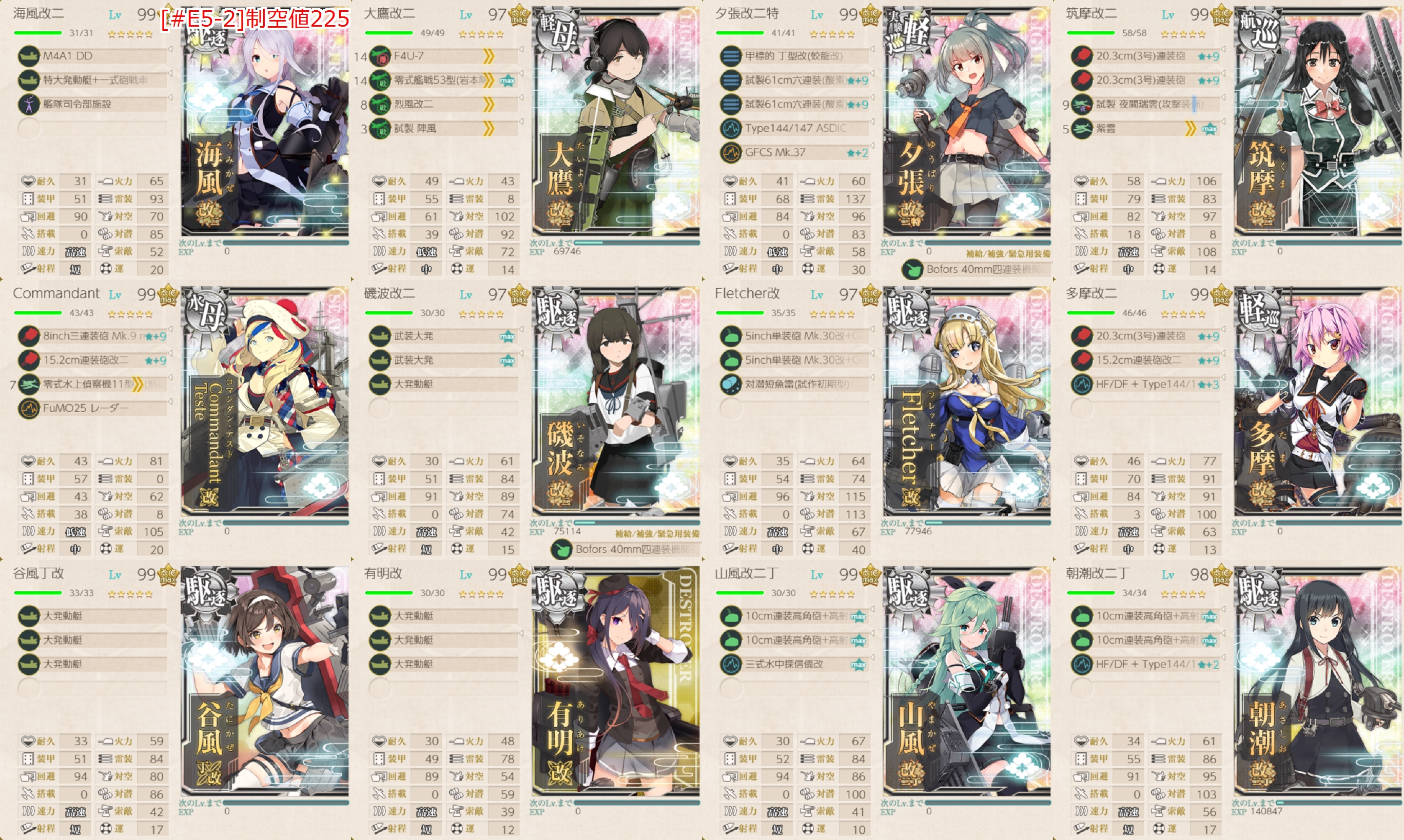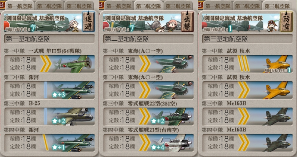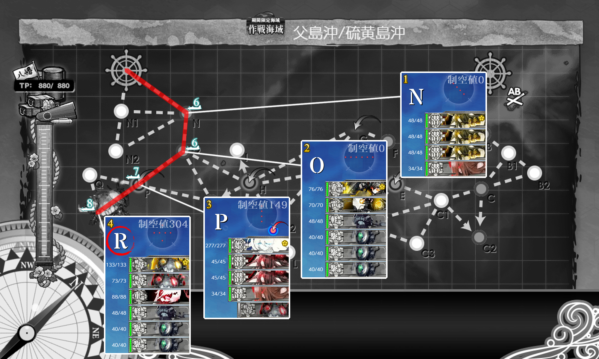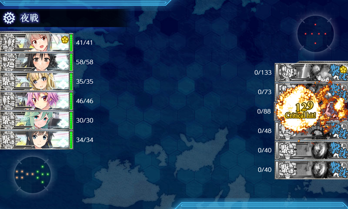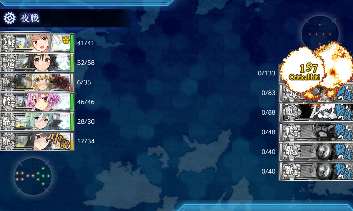 第二艦隊に先制対潜4&対空カットイン艦を入れれば問題はないと思いますがPマスの陣形が悩みました。最初後方ヌ級が砲戦攻撃ということで回避能力がある第二陣形を選びましたが対潜のほうが火力弱くなる&第一陣形のほうが枯れる&回避しやすいためこちらでやってみます。後方ヌ級対策がイマイチ固まらないので護衛退避が外せそうにないです。(`・ω・´)ゞ