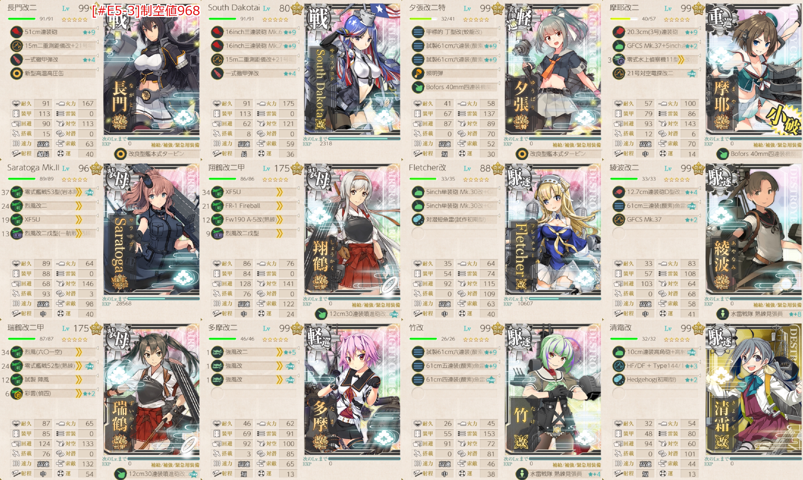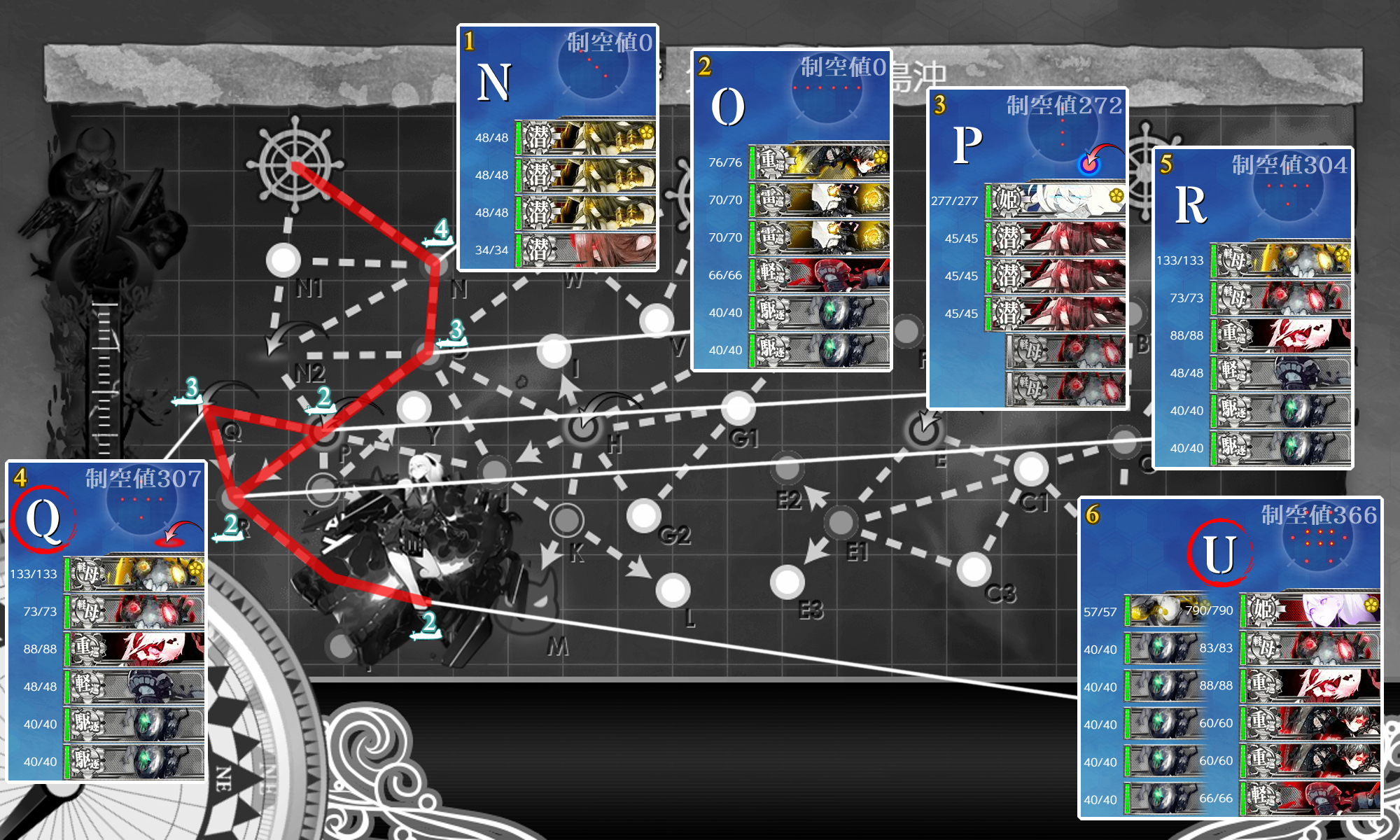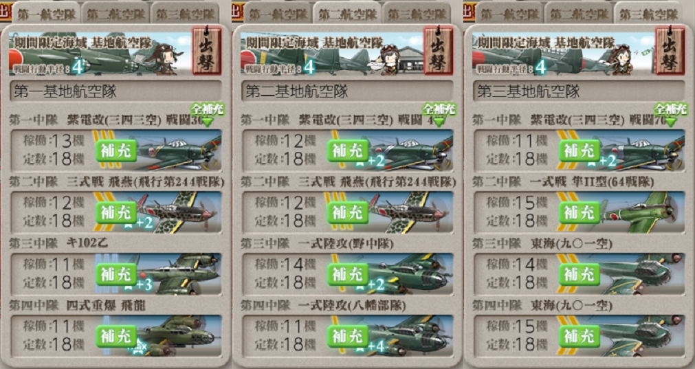 Pマスは無対策だと大破続出するためFletcherの対空カットイン&陸戦2試製東海2で安定。残り基地2つも陸戦2陸攻2(Qマス時は陸戦3陸攻1と第二の陸戦と交換)で行けたため入れ替えしなくても特効陸戦陸攻でカバー出来るのがメリットですね。