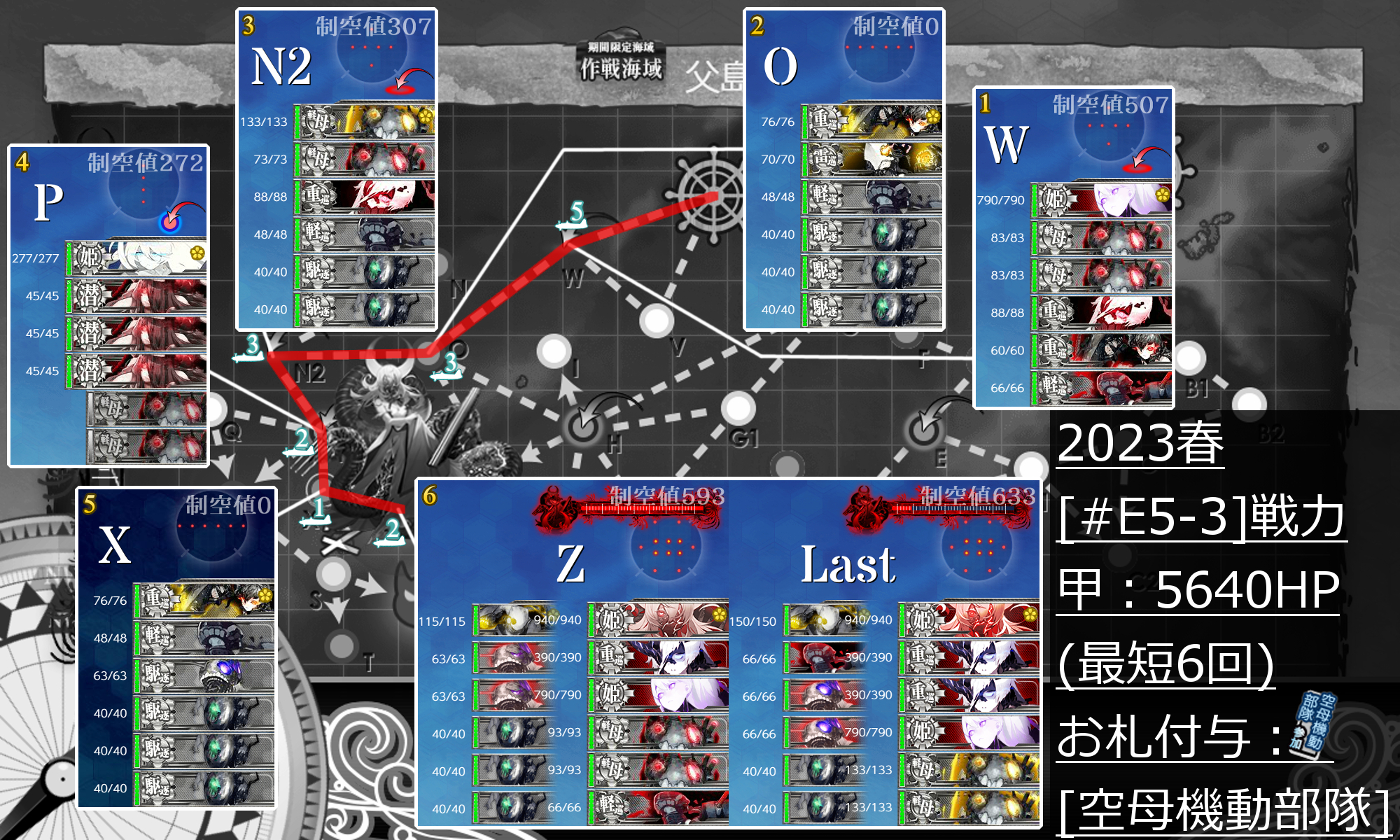 2023年03月20日 21:20 2023春イベ #E5-3甲 装甲破砕【出撃!八幡部隊】 カテゴリ:onlineGAME艦隊これくしょん コメント数:コメント(4) #E5-3甲装甲破砕さてさて体感では「大和」を編成するなら【装甲破砕】は要らないかなという感じですが「長門」編成や空母主体だとちょっと火力が足らないかなという印象なので「大和」を投入出来ないならやっておいた方が良いと思います(。・Д・)ゞ "深海重巡水姫"を"深海重巡水姫-壊"へ移行させる。(≒ゲージを4700HP↑削る。)[空母機動部隊]Qマス航空優勢↑[空母機動部隊],[伊号作戦部隊]Uマス(#E5-2boss)A勝利↑[空母機動部隊],[伊号作戦部隊]Mマス(#E5-1boss)S勝利[第二水雷戦隊],[伊号作戦部隊]E2マスS勝利[第二水雷戦隊],[伊号作戦部隊][空襲]航空優勢↑×2G2マス航空優勢↑[第二水雷戦隊],[伊号作戦部隊]Wマス航空優勢↑[空母機動部隊] 手順1手順2手順3手順4手順5手順6装甲破砕←Click切替 ゲージ削り まずは『ゲージ削り』。という名の本攻略。高速統一が条件なので「長門」等の使い勝手がちょっと悪いですが削り段階ならどうとでもなる感じ。ただ特殊砲撃があまり刺さってる感がないので「大和」編成にするか"空母"主体の方が楽かも。 編成(空母機動部隊)/お札:[空母機動部隊]▼Click 編成この段階から札なし艦を"空母機動部隊(水上打撃部隊)"に編成したら[空母機動部隊]札が付くようになっています。 "軽巡2+駆逐5"が最短√条件のようなんですが"軽巡2+駆逐4+重巡1"は例外っぽいので「摩耶」を編成しました。 第一艦隊は「長門」を特殊砲撃の倍率重視にして何とかという感じなので投入出来るなら「大和」の方が良さそう。 それか旗艦「South Dakota」+"空母"4の"空母"主体編成の方が良いかも。「長門」→「Intrepid」/「Hornet」とか。 または「摩耶」を第一艦隊に編成して「South Dakota」を第二艦隊に編成するのもありかな?第一艦隊に"戦艦"0だと対潜空襲戦(P)が2巡しないですし第二艦隊から戦闘が始まる"空母機動部隊"なので多少の道中事故率低下にも繋がるはず。 第二艦隊は削り段階だからと結構適当。「清霜」は札が付いてたのでとりあえず対潜役として編成してますが最終形態では別の火力役に変えるかも?ただ「大和」を編成しようと思っているのでそのままになる可能性も。 「摩耶」+「Fletcher」+基地航空隊1部隊になるので対潜空襲戦(P)は割と安定させられるはずです(・◇・) 制空値この制空値でギリギリというか1回か2回ボス戦で航空優勢が取れなかったので「瑞鶴」の"彩雲"も"艦戦"の方が良いかも。 サブ「長門」「South Dakota」「Saratoga」「翔鶴」「瑞鶴」「夕張」「摩耶」「Fletcher」 (赤字はサブ、青字はメインですが他にサブあり) 基地航空隊 第一航空隊:【Zマス】に集中。必要行動半径は【2】[航空劣勢×2] 第二航空隊:【Zマス】に集中。必要行動半径は【2】[航空劣勢×2] 第三航空隊:【Pマス】に集中。必要行動半径は【2】[航空拮抗×2] Qマス航空優勢↑+UマスA勝利↑ 次は『Qマス航空優勢↑+UマスA勝利↑』。同時に狙えるので狙いつつ駄目だったら編成を調整してもう1回出撃。 編成(輸送護衛部隊)/お札:[空母機動部隊],[伊号作戦部隊]▼Click 編成ほぼ[#E5-2]編成と同じですがどうやら低速混在+"水母+軽母+重巡級"4↑で"Qマス"に逸れるようなのでこんな形に。 "Qマス"航空優勢↑が取れたあとに撤退したら「筑摩」→"軽巡/駆逐"に変えて「大鷹」の装備とかも変えて"Qマス"をショートカットする形で"Uマス"A勝利を狙いましょう(。・Д・)ゞ最初はS勝利指定だと思って"Uマス"A勝利を取ったあとに再度出撃してS勝利を取りましたがSEが鳴らなかったので"Uマス"はA勝利でokなはず。 制空値"Qマス"は"軽母,水母"だけだと航空優勢が取れないので基地の削り(拮抗×2)込みで到達時制空値330あれば足りるはず。 サブ「Commandant Teste」「夕張」「Fletcher」「摩耶」「筑摩」「朝潮」 基地航空隊 第一航空隊:【Qマス】に集中。必要行動半径は【3】[航空拮抗×2] 第二航空隊:【Uマス】に集中。必要行動半径は【2】[航空劣勢×2] 第三航空隊:【Pマス】に集中。必要行動半径は【2】[航空拮抗×2] "Qマス"航空優勢↑が取れて"Uマス"A勝利が取れなかったら次は第一,第二航空隊を"Uマス"に集中しましょう。 MマスS勝利 次は『MマスS勝利』。最終形態編成だったらちょっと大変でしたが削り段階編成なら特に問題なし。 編成(遊撃部隊)/お札:[第二水雷戦隊],[伊号作戦部隊]▼Click 編成[#E5-1]とほぼ一緒。"駆逐"は対潜寄せ。 制空値ボスは制空値0なので道中の空襲戦(G)で航空拮抗が取れる制空値203↑まで稼ぐのが良いかな? サブ「矢矧」「最上」「瑞鳳」「Fletcher」「山風」「朝潮」(赤字はサブ、青字はメインですが他にサブあり) 基地航空隊 第一航空隊:【Mマス】に集中。必要行動半径は【3】[制空権確保×2] 第二航空隊:【Mマス】に集中。必要行動半径は【3】[制空権確保×2] 第三航空隊:【Hマス】に集中。必要行動半径は【2】[航空拮抗×2] E2マスS勝利+[空襲]航空優勢↑ 次は『E2マスS勝利+[空襲]航空優勢↑』。特に難しくないので一緒に[空襲]迎撃。 編