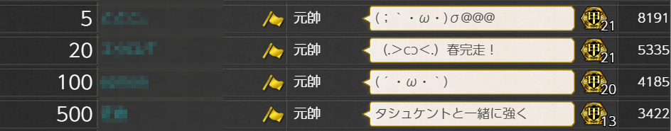 それにしても最終更新でがっつり伸びましたねぇ、[3/30 15:00]更新で戦果2771、[3/31 03:00]更新で戦果2976(+205)まで上がったので戦果3200ぐらいまで上がるかなー?とか思っていたら[3/31 15:00]の最終更新で戦果3422(+446)は完全に想定外で余裕を持ったつもりが圏外という感じでした_(:3 」∠ )_