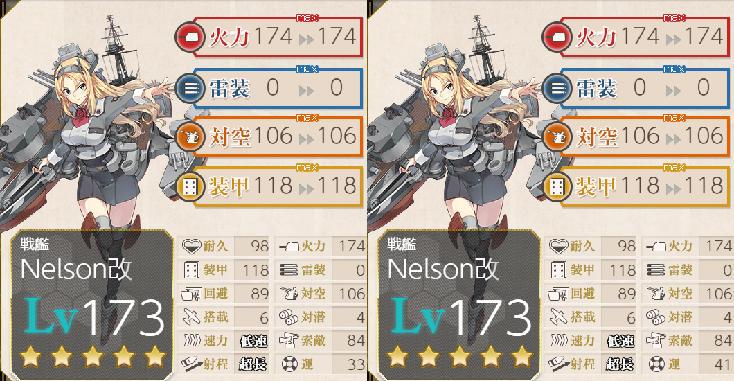 「綾波」とか「霞」をしっかり[運50]ラインに載せるのもありかなー?とかも思ったんですが「Nelson」には指輪も渡してますし支援艦隊として編成することもあるのでとりあえず1回運改修して「長門」と同等の運にしようかなということで。