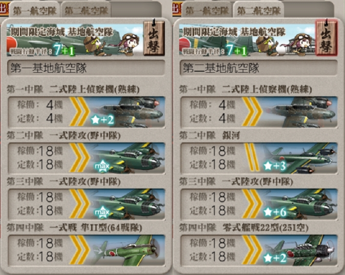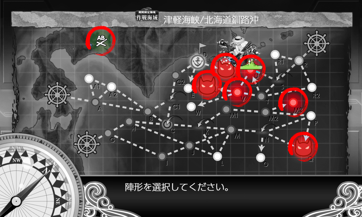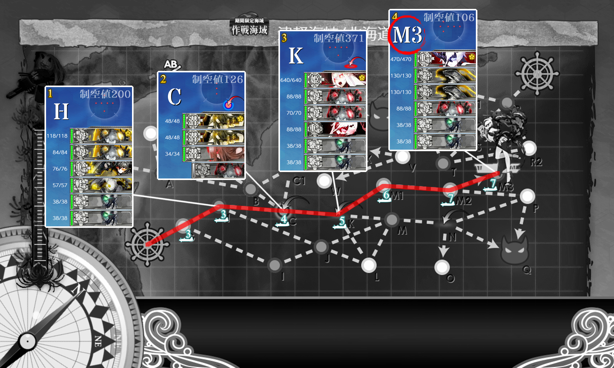 M3マスは戦艦2重巡3の高速+モード。基本的には短縮ギミックとほぼ同じですのでそこまで手こずりませんでしたがVマスS勝利が基地2小隊でもイマイチ刺さらなかったため第一艦隊2巡目でギリギリでした。道中支援を送ったほうが安定するように思います。