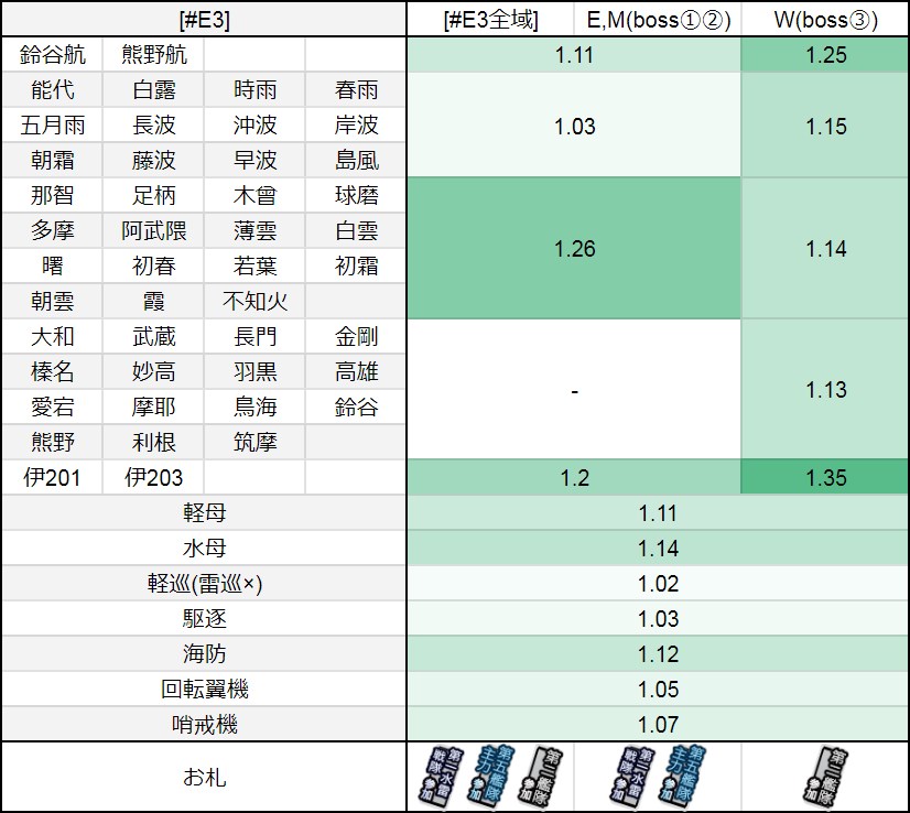 [#E3]は[#E3-1]と[#E4-1]が同一札(第一水雷戦隊)、[#E3-2]と[#E4-3]が同一札(第五艦隊主力)、[#E3-3]と[#E1-2]が同一札(第二艦隊)という海域なのでその辺りをしっかり意識して編成を組むと吉。