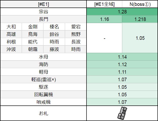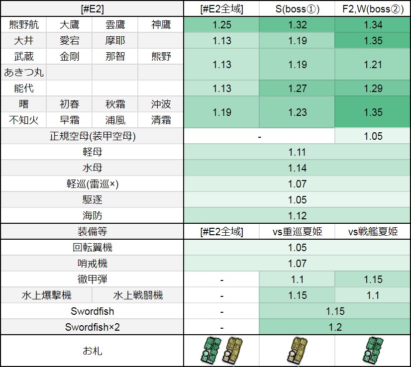 例えば「長門」は[#E1-2],[#E3-3]どちらでも特効倍率付与されているので[第二艦隊]札はお得とかそんな感じで。