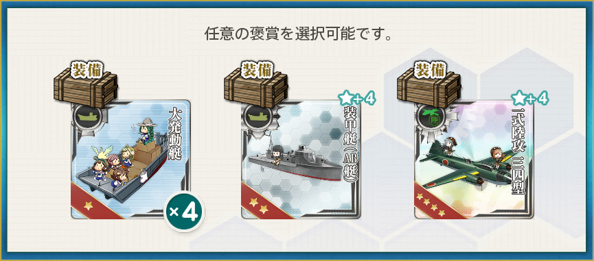 選択報酬は装甲艇(AB艇)★4と南瓜3にしました。前者は三四型の上位改修に何かしらくるというのが2年前からあるようですが、深山同様多分ないと思えますし1つ持っているので万が一は持っているもので対応出来ること。装甲艇(AB艇)は武装大発でカバー出来ますが作るとなるとなかなか大変なので★付け前提で選びました。