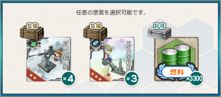 後続任務で[25mm単装機銃]★10が必要なので燃料に余裕があるなら機銃を選ぶのもありと言えばありですけど機銃は開発コストが安いので燃料を貰ってそれを何かに使う方がお得になりそうな気がします。
