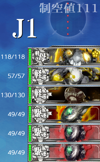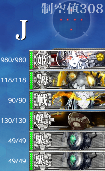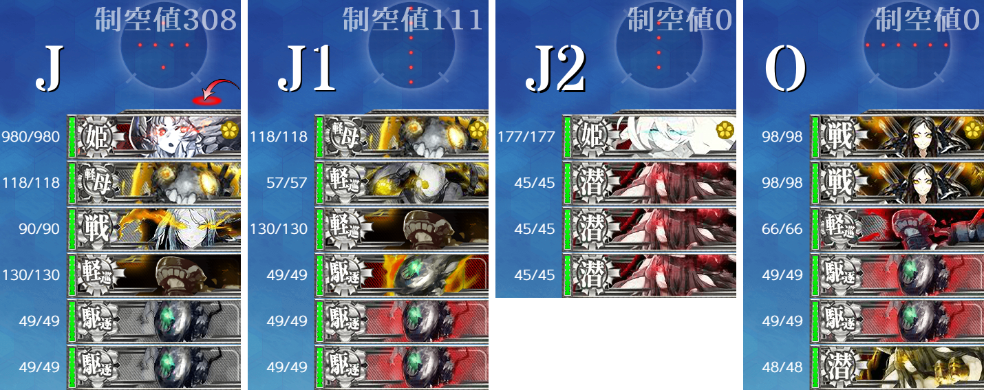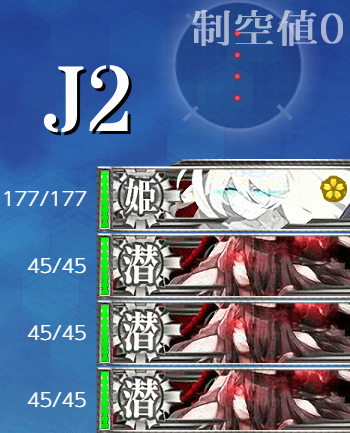 3戦目潜水新棲姫も丙個体177なので基地と対潜2で大体通れました。先制対潜はソナー爆雷2で1発姫を葬れる火力でしたのでJ1さえ抜ければ問題なく安心でした。