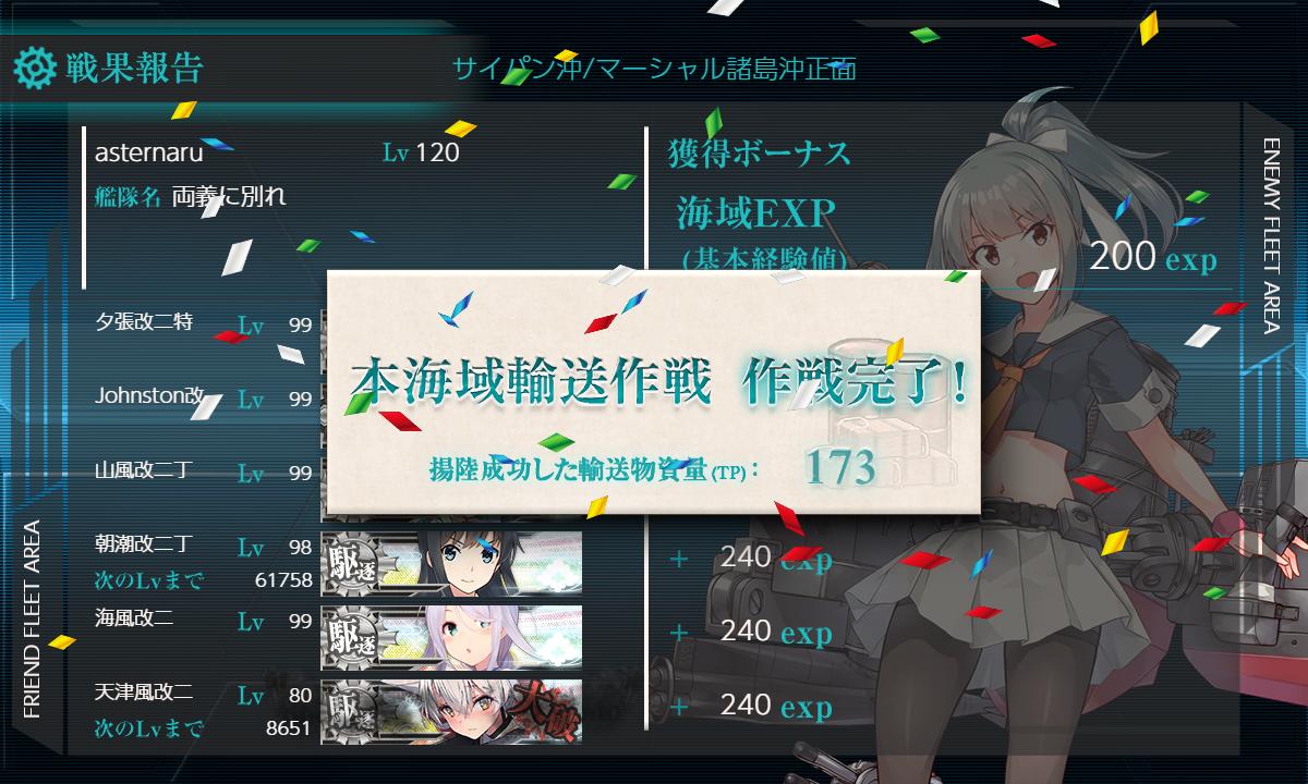 最後は夜戦までかかりましたが他は昼戦で終わったかな?対潜役とか調整しながらだったので最後は173TP。