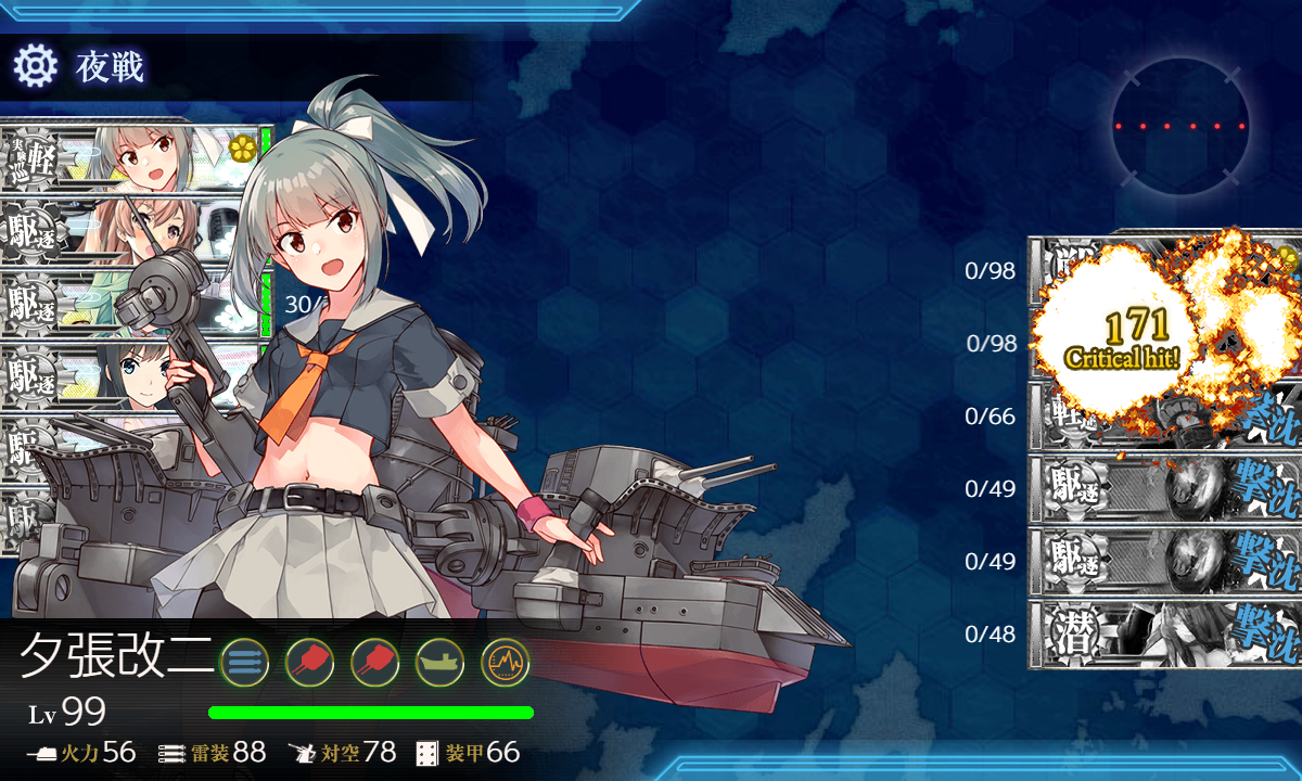 ボス戦は輸送護衛部隊の戦力がないので基地と決戦支援で対応すれば1~2隻になりますので最悪夜戦までやれば問題なし。夕張を夜戦対策にしたのですが夜戦は1回もやらず大体雷撃戦→第一艦隊で対応可能でした。
