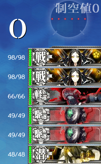 私は龍鳳と日進で制空調整しつつ第二に鬼怒と能代で連撃役という構成にしました。基地でそれぞれのマスをきちんとケアできるので撤退もなかったしボスも簡単・・・じゃなかった。T不利を引くと敵潜水艦がものすごく仕事をすることがあります。そういう意味でnaruさんのように航空戦艦入れたほうがいいかも(瑞雲禁止)。(私の場合、ほとんど全部が潜水に吸われる。。。)