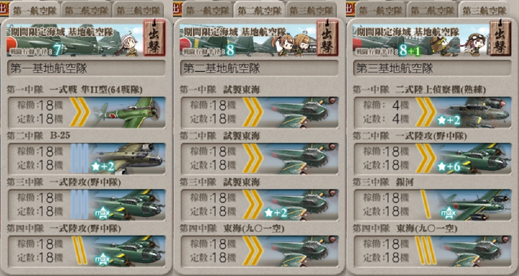 夕張特は主砲2甲標的電探2、朝潮丁、ジャベリンは3スロ先制対潜。他は大発動艇で合計20個、基地航空隊はnaruさんと同じ対応ですが、ボスだけ陸攻4。第二陣形&先制対潜2で丁字不利でも落とせました。