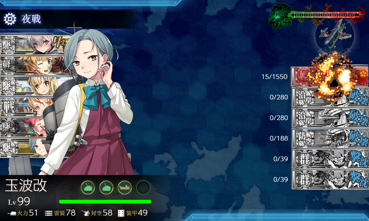 最後は「玉波」が決めて終わり。残り15HPの相手に1発目が至近弾だったので怖かったですがセーフ。