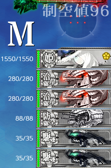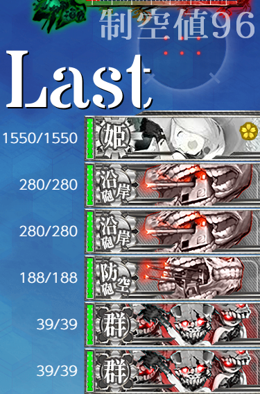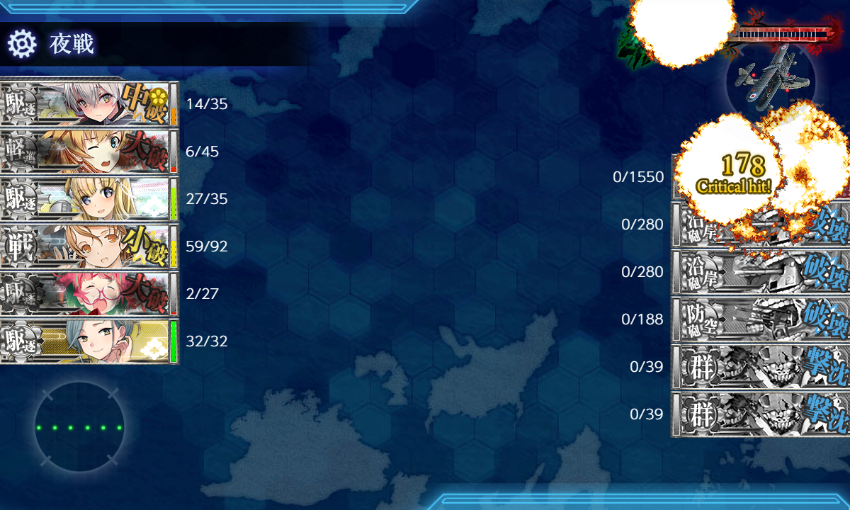 天霧を簡単に使うわけにはいかないのでSボートの始末が結構苦労しました。ラスダンのみ決戦支援、道中は最後までノー支援でした。Gマスでちょいちょい追い返されましたが比較的警戒陣で道中は抜けやすいかな?って感じですかね?対空担当が1人は欲しいかなー。