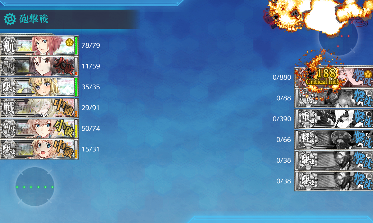 サラトガ(白)、照月、タシュケント、伊勢、イントレピッド、長波。一応夜戦フィニッシャーとしての長波なのですが昼戦で終わるか夜戦最初にサラが決めたので対潜役にしてしまって潜水マスを完封してもいいかも。私は潜水で撤退が結構あった・・・ソ級はダメです。
