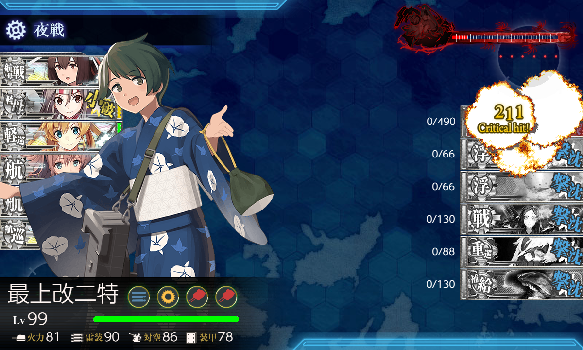 あとは最終形態になったら「最上」の[阻塞気球,水戦]→[主砲×2]にして夜戦連撃仕様に。