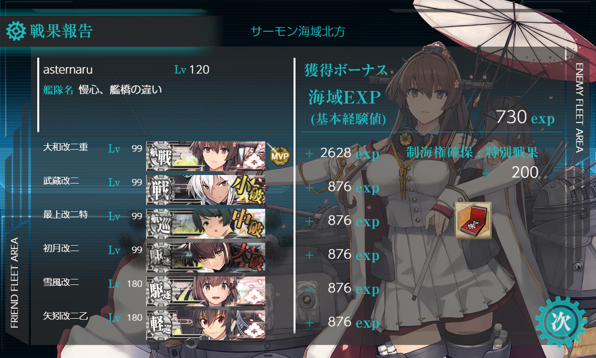 いつもの編成ですが引き続き「Fletcher」→「初月」お試し(・◇・)大和型は旗艦ローテーション。